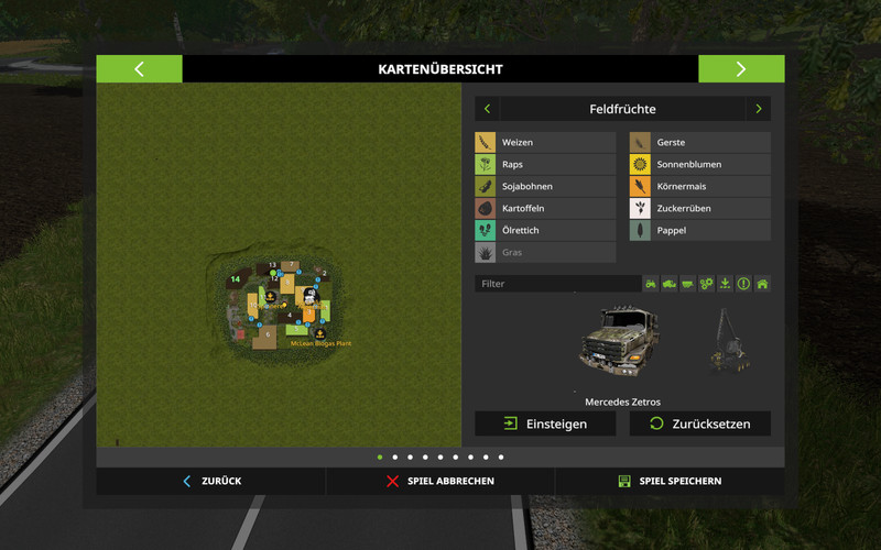 14 fields that need to be managed, 2 meadows, 1 BGA with the new Fliegl Biomat, a village, a garden center and dealer, as well as a farm with all animals and suitable vehicles.