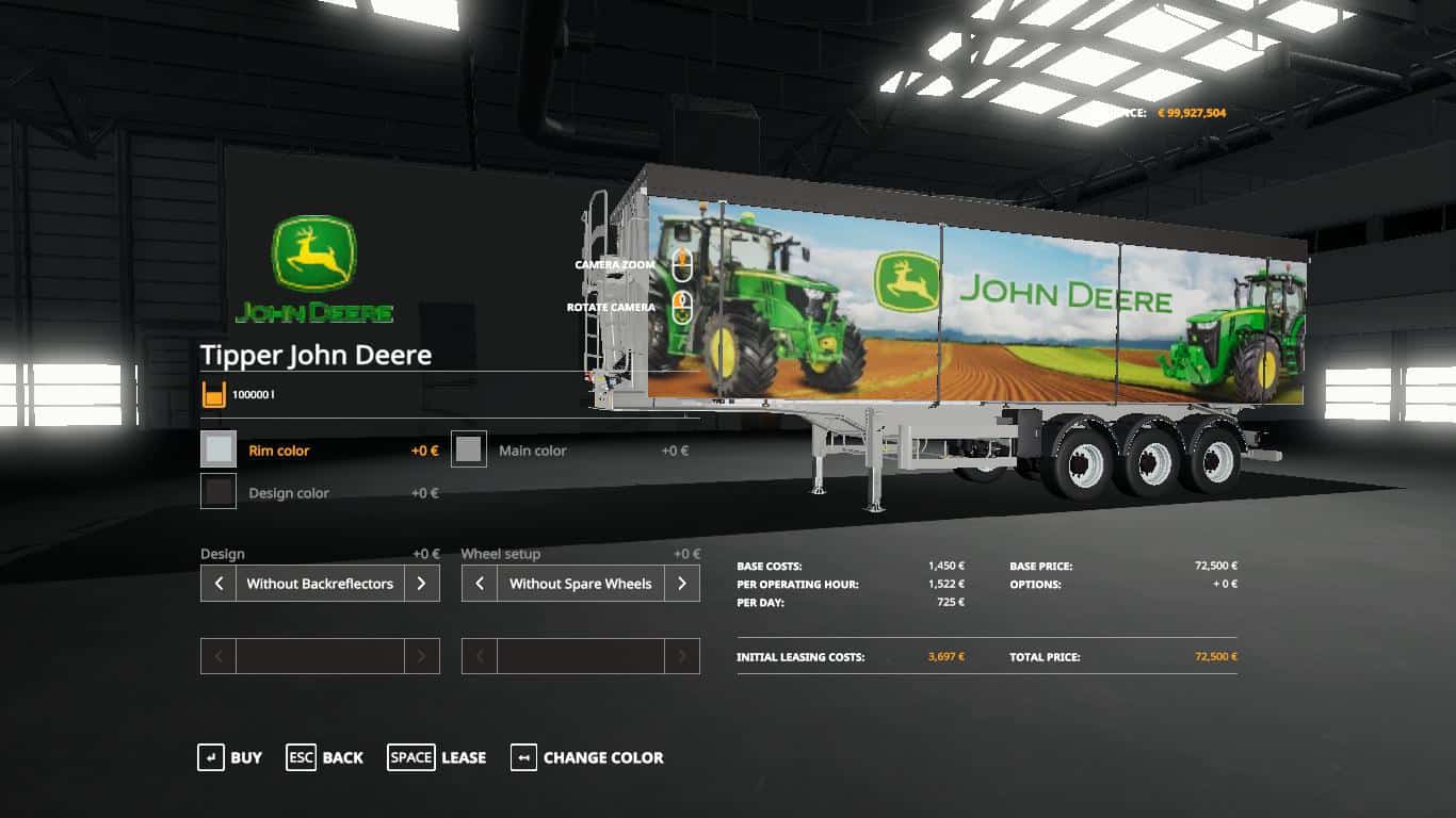 Capacity: 63000l – Price: 72500 – Press X to unfold the ladder (you can climb it up to take a look into the tipper) – lift axle – Color selection for the trailer, the cover and the rims – Configuration for reflectors at the backdoors – Configuration for spare wheels Please be aware that this is a tipper trailer which may not be good to use in small buildings. Tipping angle is 37° (normal) or 18° (tipping via graindoor). Max. height while tipping is 9,6m (normal) or 7,1m (tipping via graindoor) which is close to real world values.