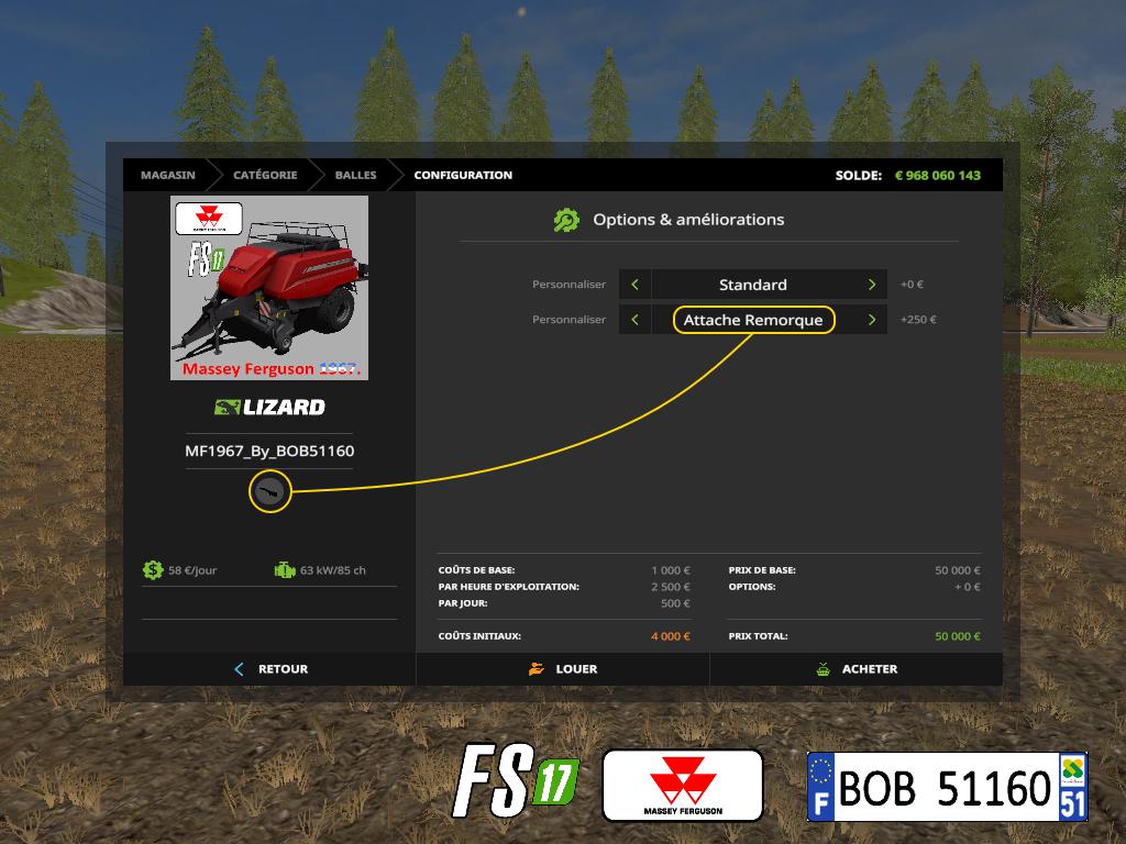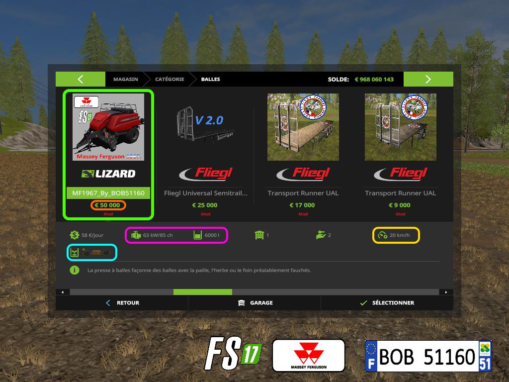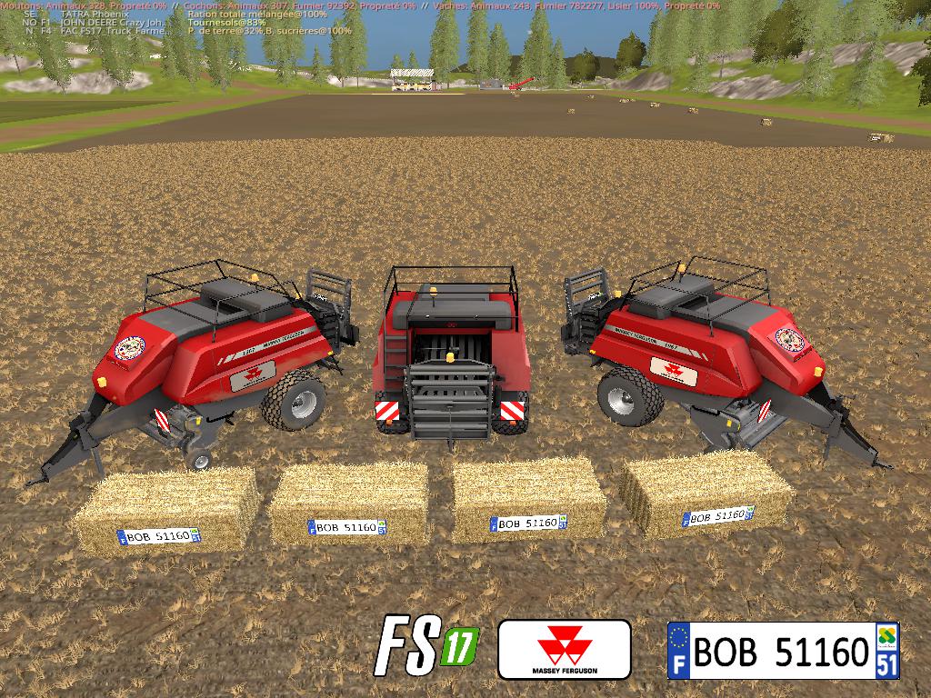 Bonjour a tous, aujourd’hui je vous présente une 2eme fois le mod FS17 BigBaler MF1967 By BOB51160,Le bug que j’avait déceler était la plaque arriere au niveau de la trappe, le probleme est résolue. Capacity: 6000 Kg, Puissance Minimum 85,Prix: 50.000€. Pour plus de renseignement voir les photos ci joint bon jeu a tous. BOB51160.