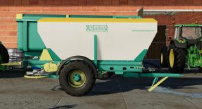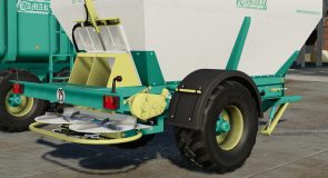 Fertilizer spreader mounted on a single-axle chassis. Hydraulic powered sliding belt spreading system.