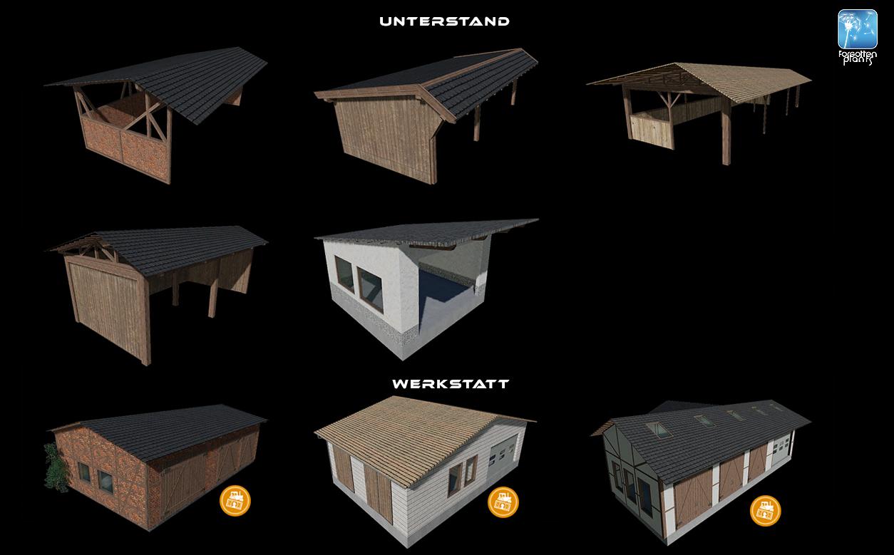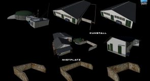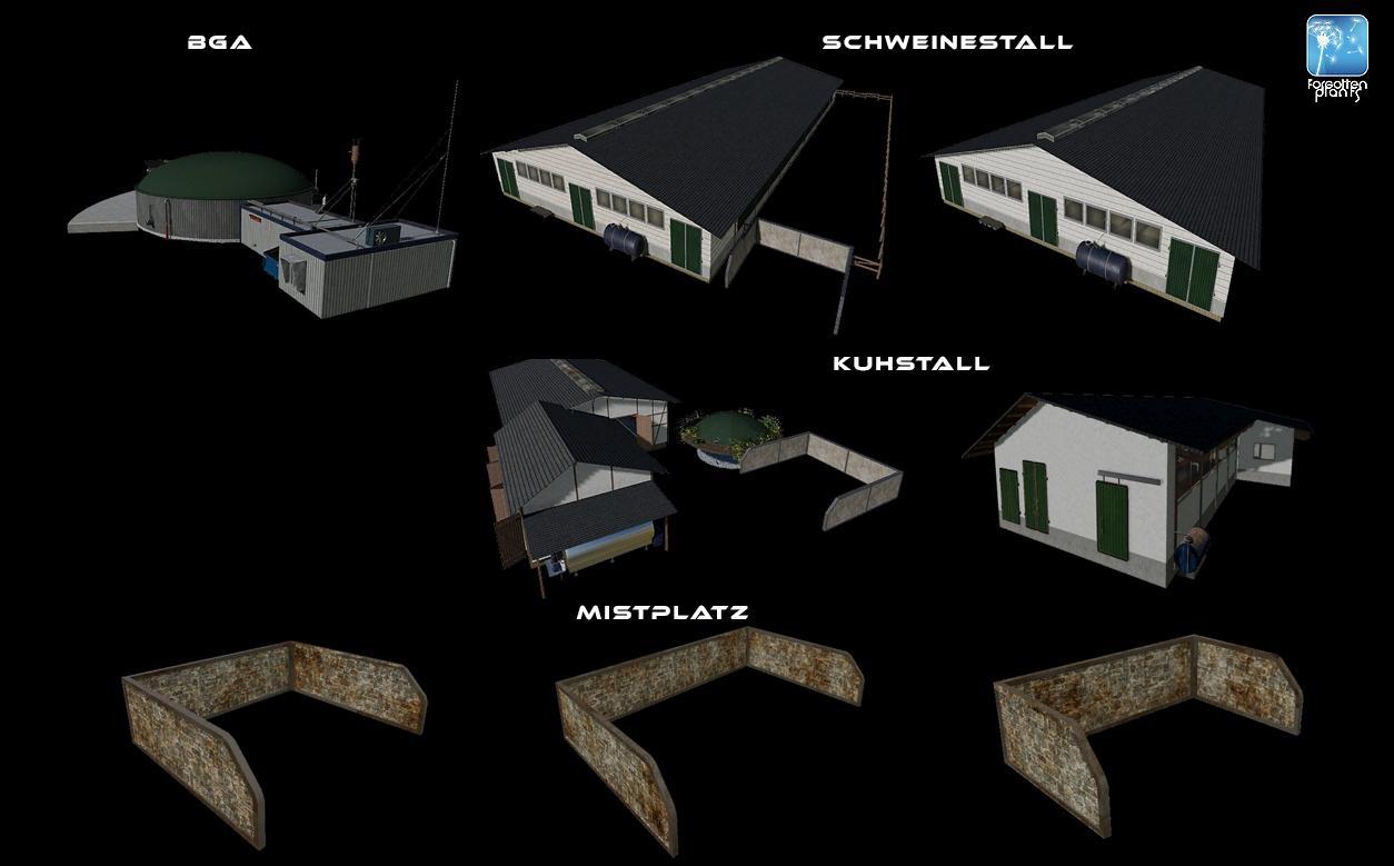 27 placeable buildings, halls, shelters, cowsheds, pigsties, BGA and workshops with lights and gates