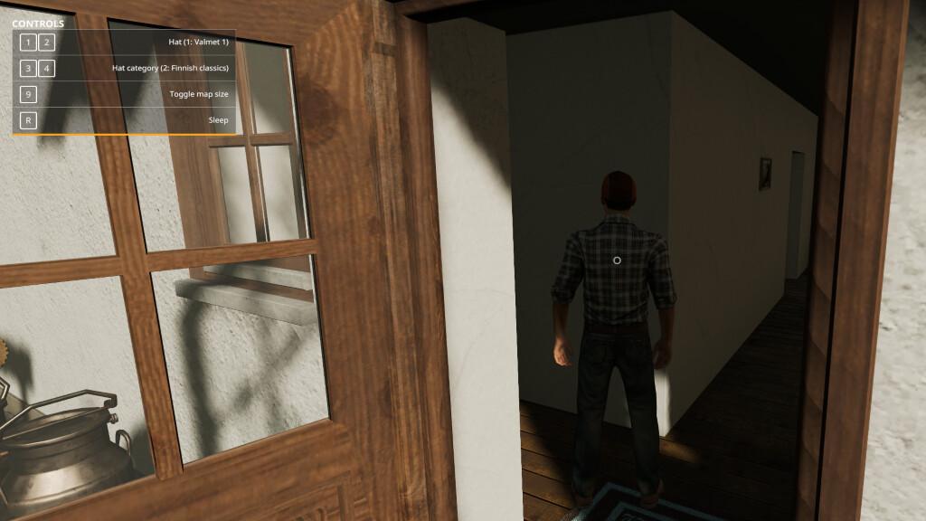 You can change the hat inside farmhouse by selecting category (game originals and Classic Finnish hats) and then selecting a hat with keys 1 and 2.
