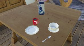 Place the cup in a free space, crouch down as flat as possible in front of the cup, grab it so that it can be picked up optimally and placed elsewhere.