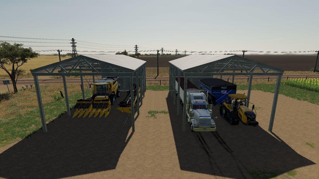 A 10 x 20 meter steel shed with a solid rear wall for bale stacking or vehicle storage.