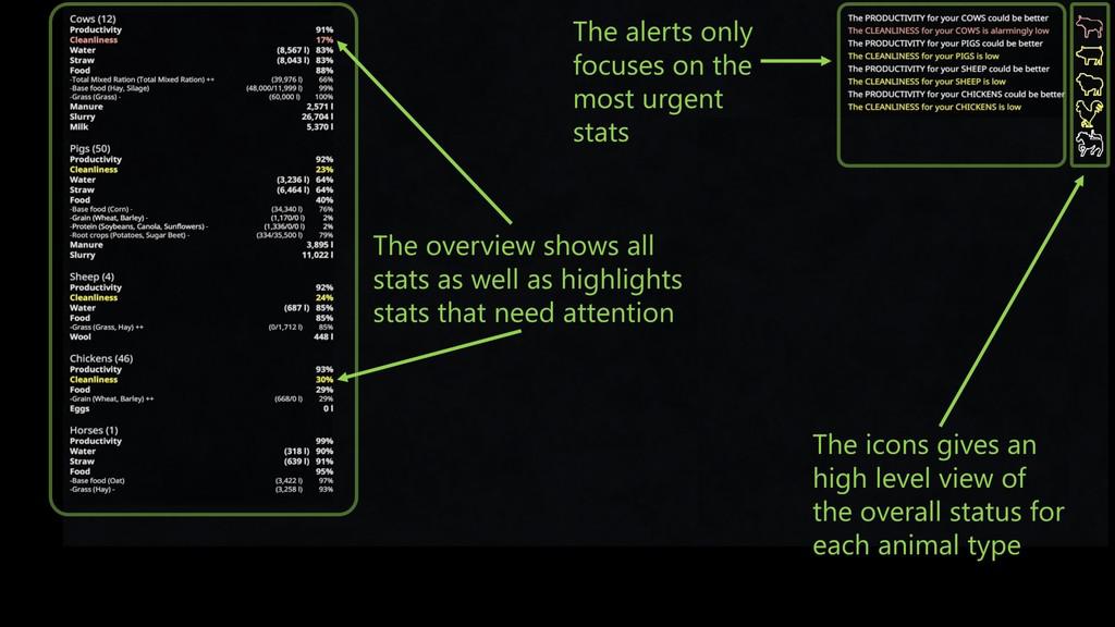 Stockman HUD gives you an overview of your animal husbandry with alerts and summaries for the most important stats. The basic idea is to focus only on the information you need at the moment and highlight important stats so you can be effective when caring for your livestock.