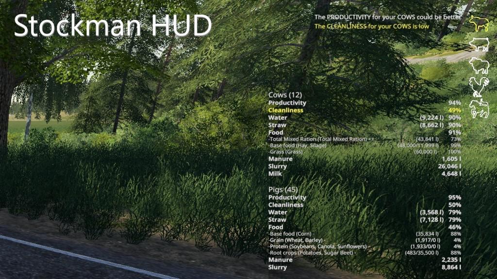 Stockman HUD gives you an overview of your animal husbandry with alerts and summaries for the most important stats. The basic idea is to focus only on the information you need at the moment and highlight important stats so you can be effective when caring for your livestock.