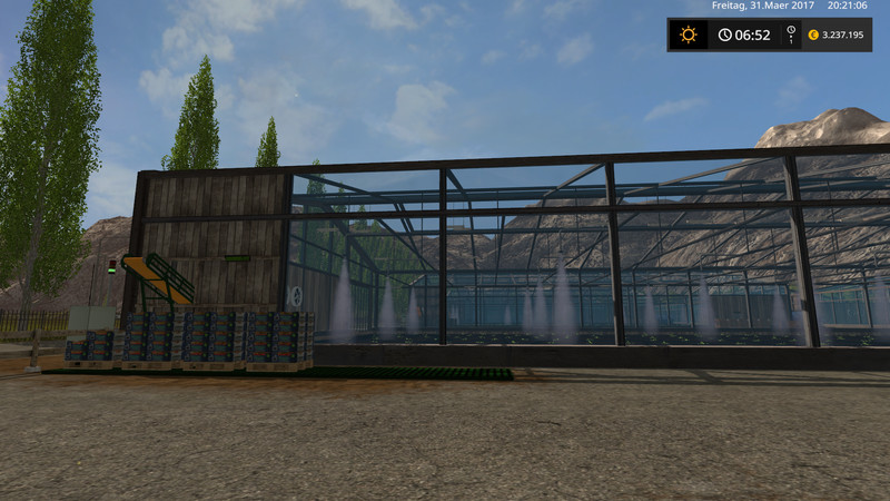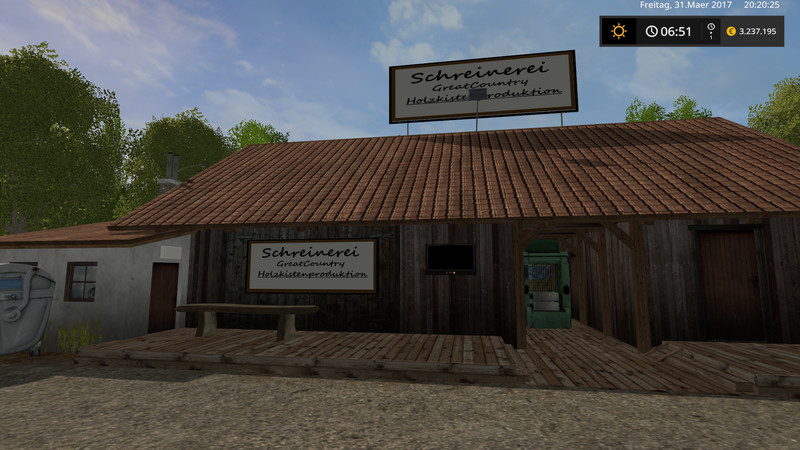 The Seedmaster, Seedmixer, Mixing Station, Beer Production, Pallet Production, Barley Malt Production, Liquid Fertilizer Production, Biodiesel Production, H-Milk and Cheese Production and the Composting System, Wood Processing from Pallet to Charcoal. A workshop for the repair of your vehicles is also available, one at your farm, one at the vehicle dealer and one near the hotel. A seed and fertilizer storage is also available. Six greenhouses from lettuce to strawberries are also found in Great Country.