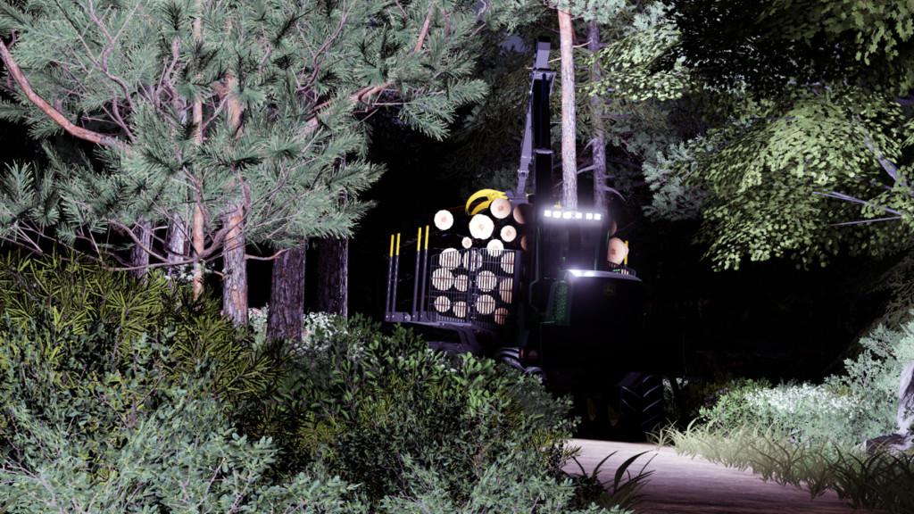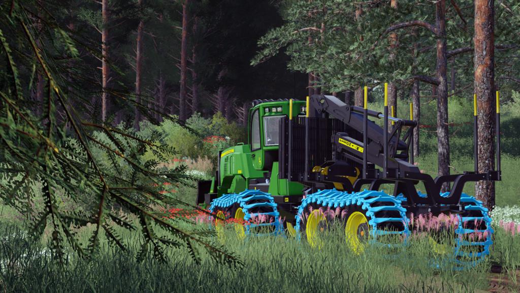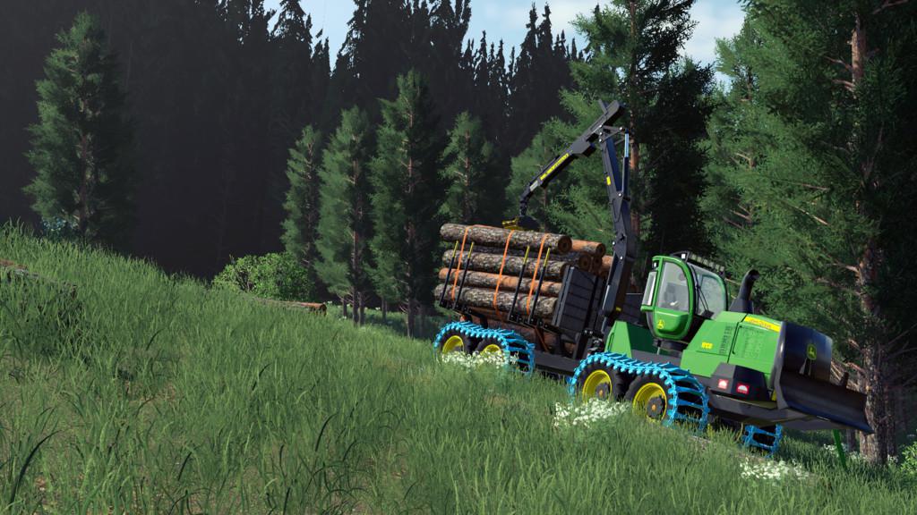 The mammoth 1910G from John Deere features a low-wide bunk (VLS) that folds for transport, bigger tires for better ride comfort compared to other forwarders and higher ground clearance. Rotating, self-leveling cab turns 290 deg. for an all-around view of boom movements for efficient log loading. A powerful CF8 crane with a Deere 040 grapple