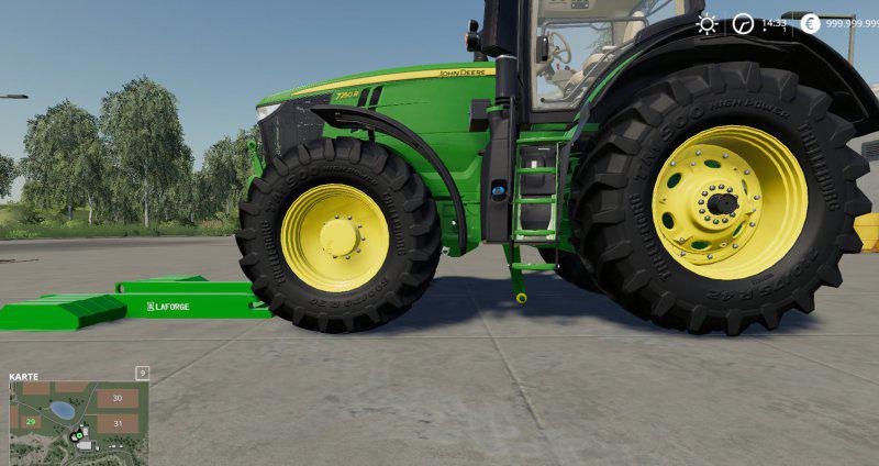 The EZ ballast underfloor ballast can be attached in a few seconds without having to get out. Simply drive the tractor in front of the weight and lower the catch hook. To do this, hold down the left and right mouse button and push it forward. When the EZ-Ballast catch hook is all the way down, drive the tractor over the weight. Connect with Q and fully lift the weight by pressing the two mouse buttons and pulling back the mouse.