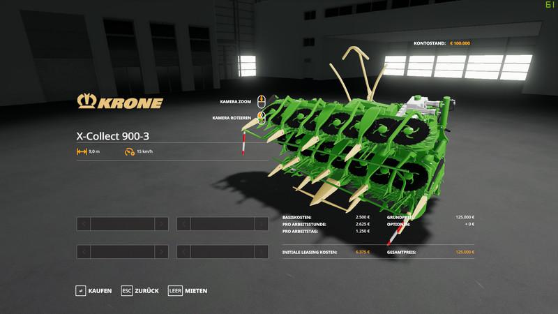 Hello Ls 19 Friends Collect 900 Pack available. The Kemper 390 Plus and the Krone X-Collect 900-3 are intended for corn and sunflowers. (Kemper 390 Plus) Working width 9m Working speed 15 Price 160000 Maintenance costs 600 (Crown X-Collect 900-3) Working width 9m Working speed 15 Price 125000 Maintenance costs 600