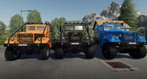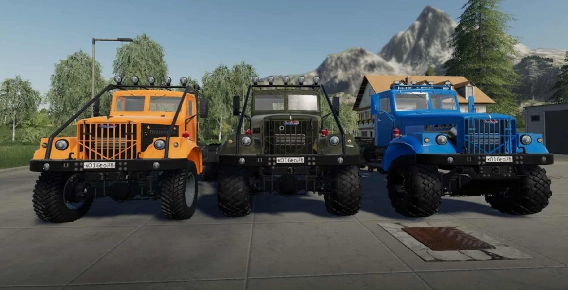Pack contains three trucks: a conventional tractor, Kraz 255B ZSK-15 and Kraz 255B dump truck, and a semi-trailer KrZ-14.