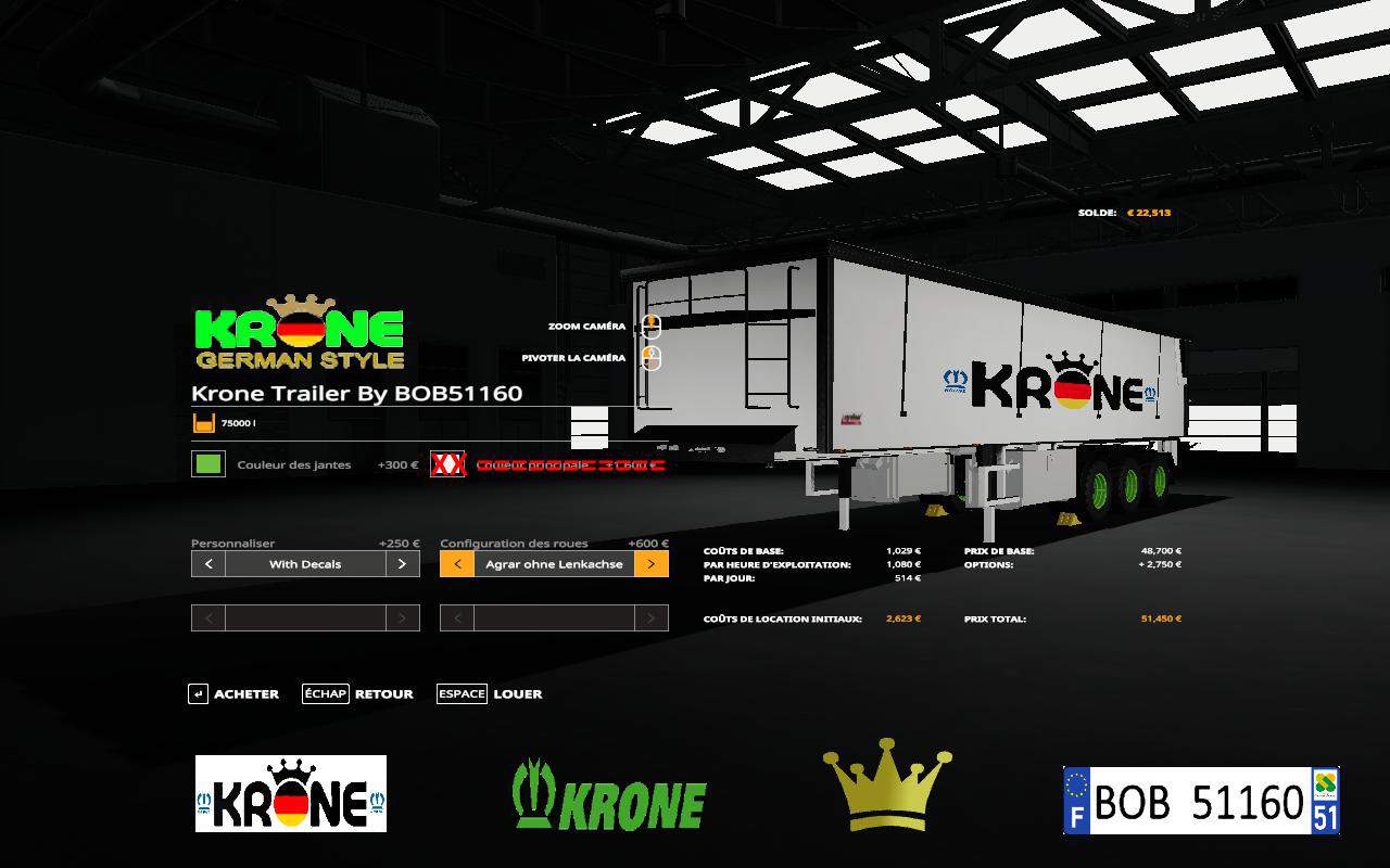 Hello everyone and has tout.Today I present you the Krone Trailer. 1 color, you can change the tires and also change the color of the rims.It has a beacon at the back and a clip to hang another trailer.CAPACITY: 75000l.