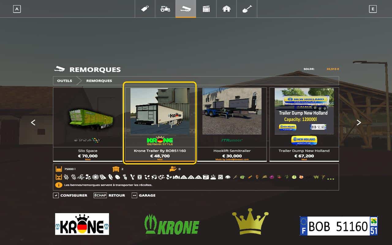 Hello everyone and has tout.Today I present you the Krone Trailer. 1 color, you can change the tires and also change the color of the rims.It has a beacon at the back and a clip to hang another trailer.CAPACITY: 75000l.