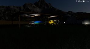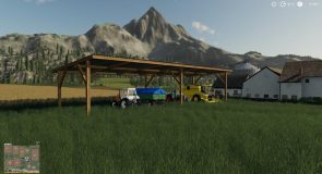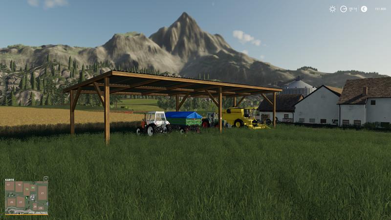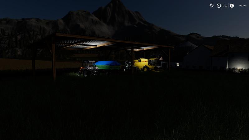 A simple placeable Large shelter with lighting, well suited for equipment or bales.