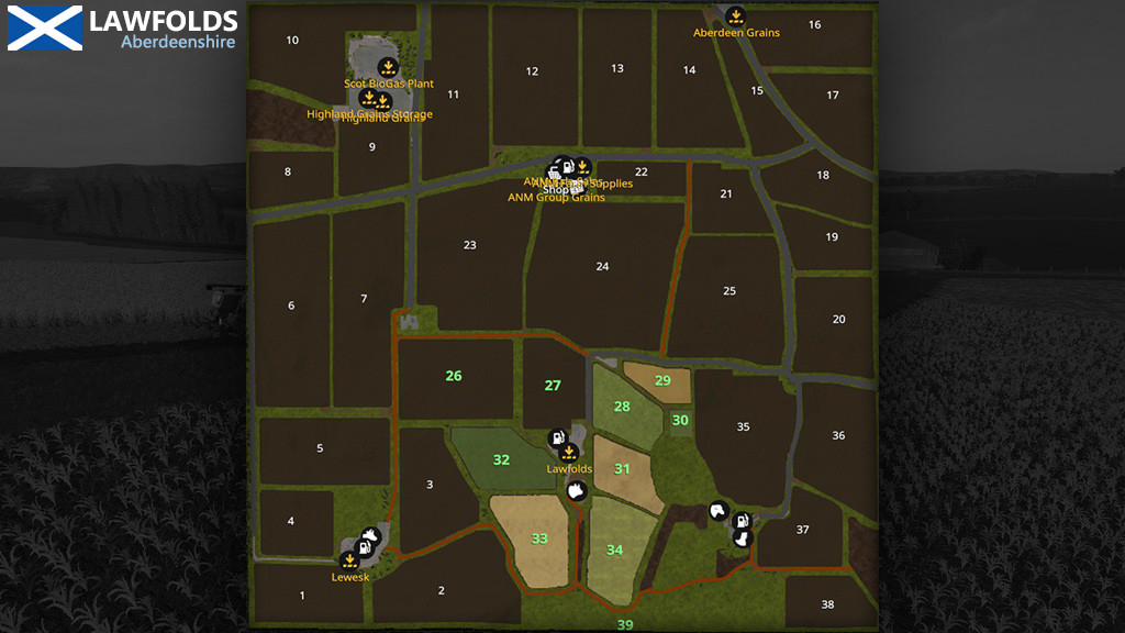 Lawfolds is based around a real working farm in the fertile rolling hills of Grampian, Scotland. There are two additional farms, East Law where the sheep can be found, and Newton of Lewesk is where the Cows are located. This map features:-