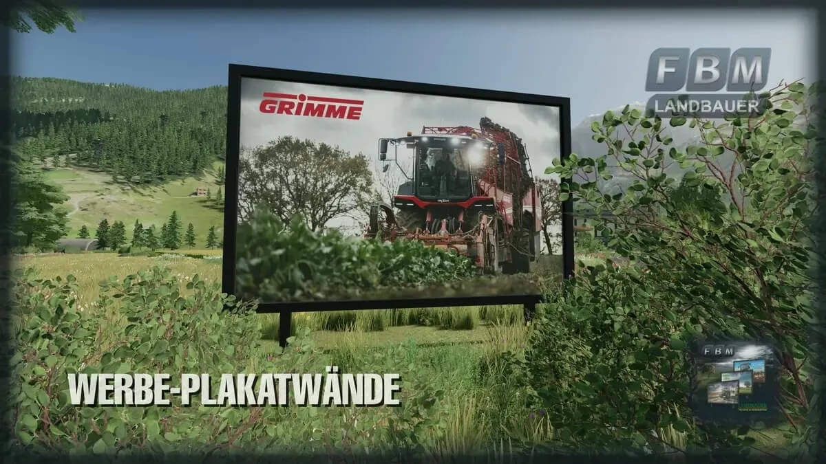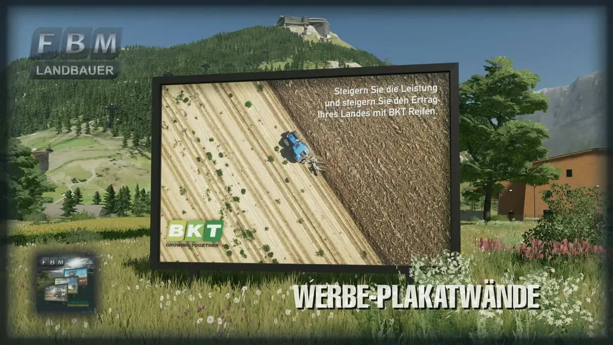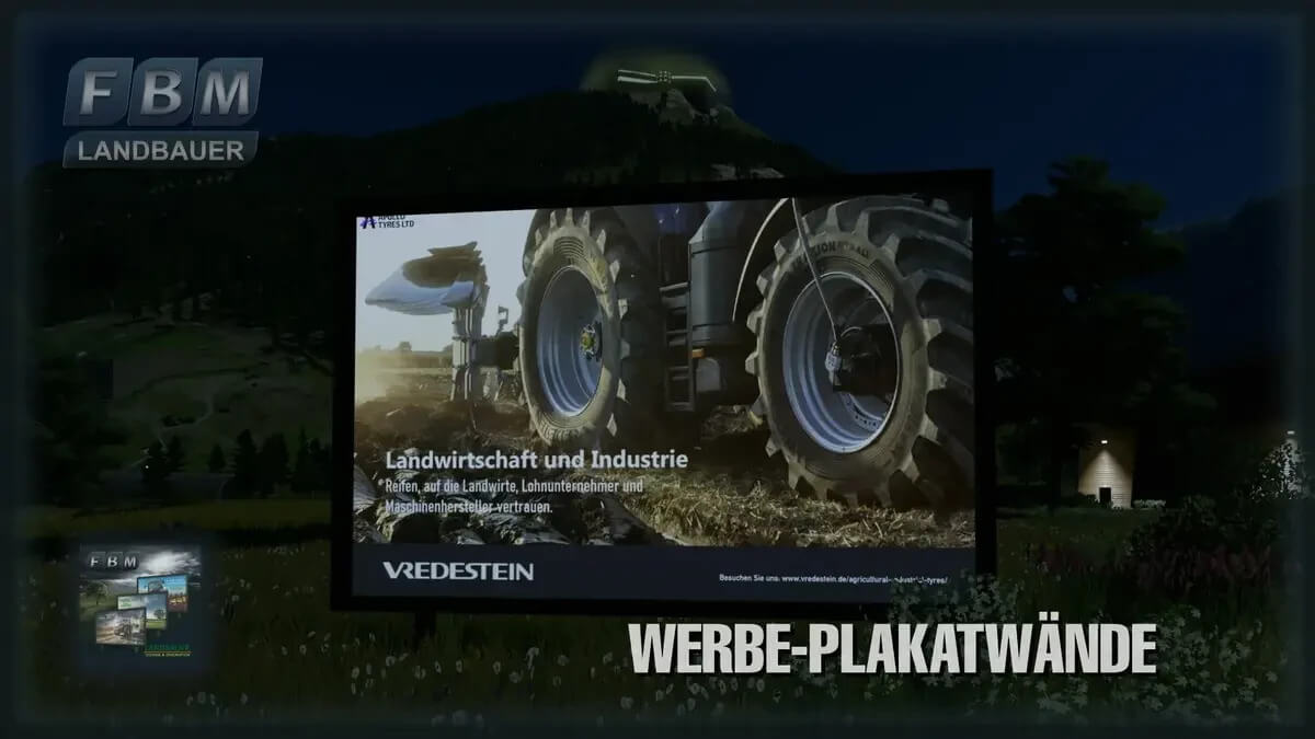 The “Billboards” package includes three large billboards with 21 different motifs. Each billboard has its own theme: tractors, farm machinery and tires. In contrast to the advertising showcases, advertising costs can be earned with the billboards.