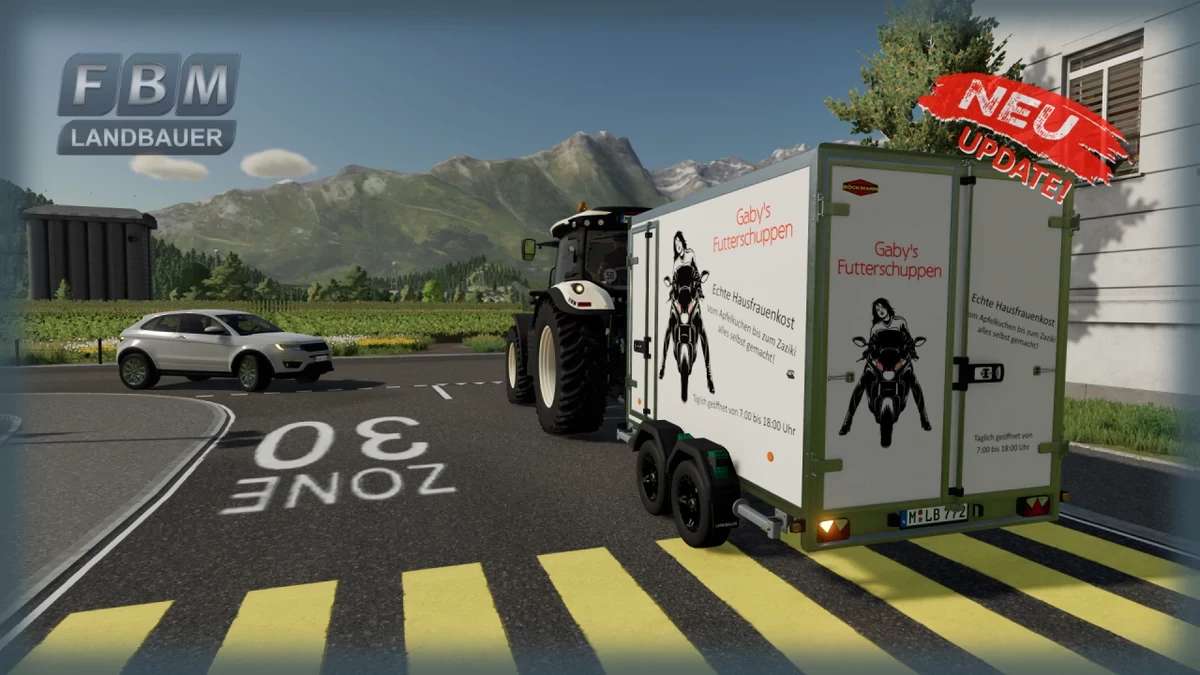 The trailer can be purchased in the original version from Böckmann with an autoload function (Achimobil pallet autoloader specialization required). You also have the option of buying or renting this trailer with a selection of advertising labels, but you will then receive money instead of paying for it. When you buy, you get €5,000 for advertising, if you rent the trailer you will make more profit after a certain time than the €5,000. The trailer currently has six different advertising motifs, one is a real brand exclusive and unique in Farming Simulator. The trailer has additional lighting, new wheel chocks including brackets, mud flap lettering, and special Landbauer rims to choose from.