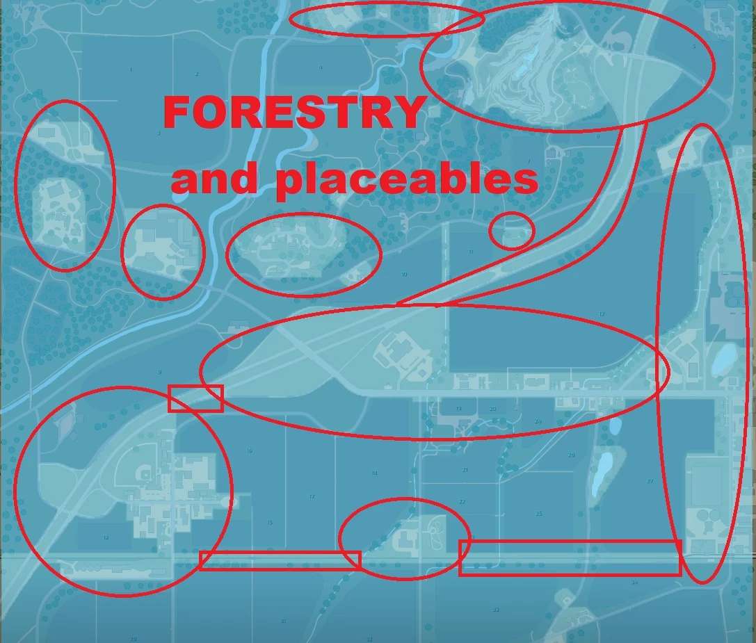 In standaard Elmcreek map the zone you could not use or buy can now be used for forestry ( including planting tree )and placing of any placeable. However no field creation!