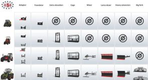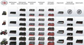 These include the following equipment: silage bucket, bucket for potatoes and beets, normal bucket, bucket with grapple, raptor bucket, bucket with central exhaust, bale fork, manure fork, fork with grapple, big fork, fork for wrapped bales, biting fork, big bag handler, extension cord, cage, adapters, translator, extra elevation, pallet fork, fork carriage for smart stack cages, pallet fork with grapple, double pallet fork, fork for logs, log shovel, hook for lifting, arm for the lift, extension for lifting, scraper, dozer blade, dozer blade with extension and mixer.