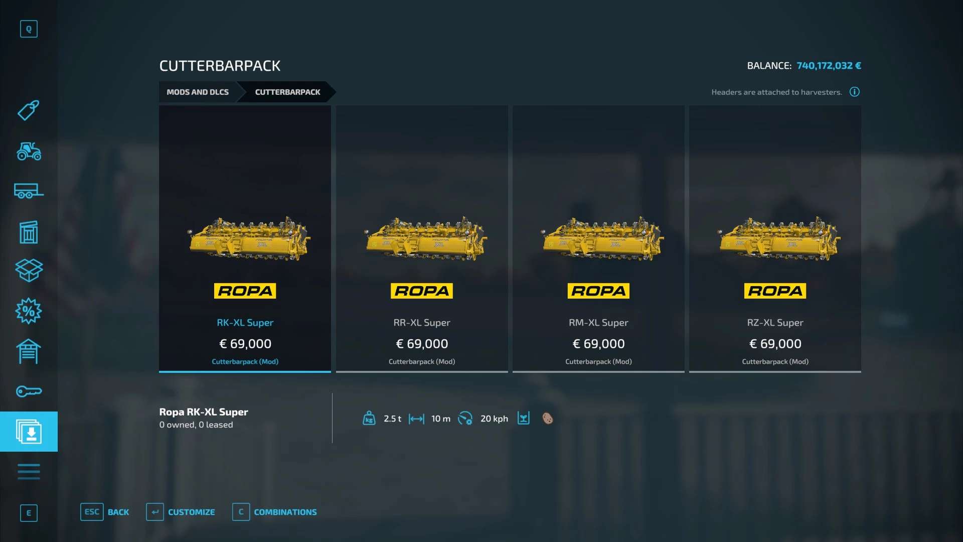 There are 4 headers for the Ropa Tiger 6s RK: potatoes, RR: beets, RZ: sugar cane and RM: carrots log is error-free working width 10m working speed 20km/h.