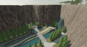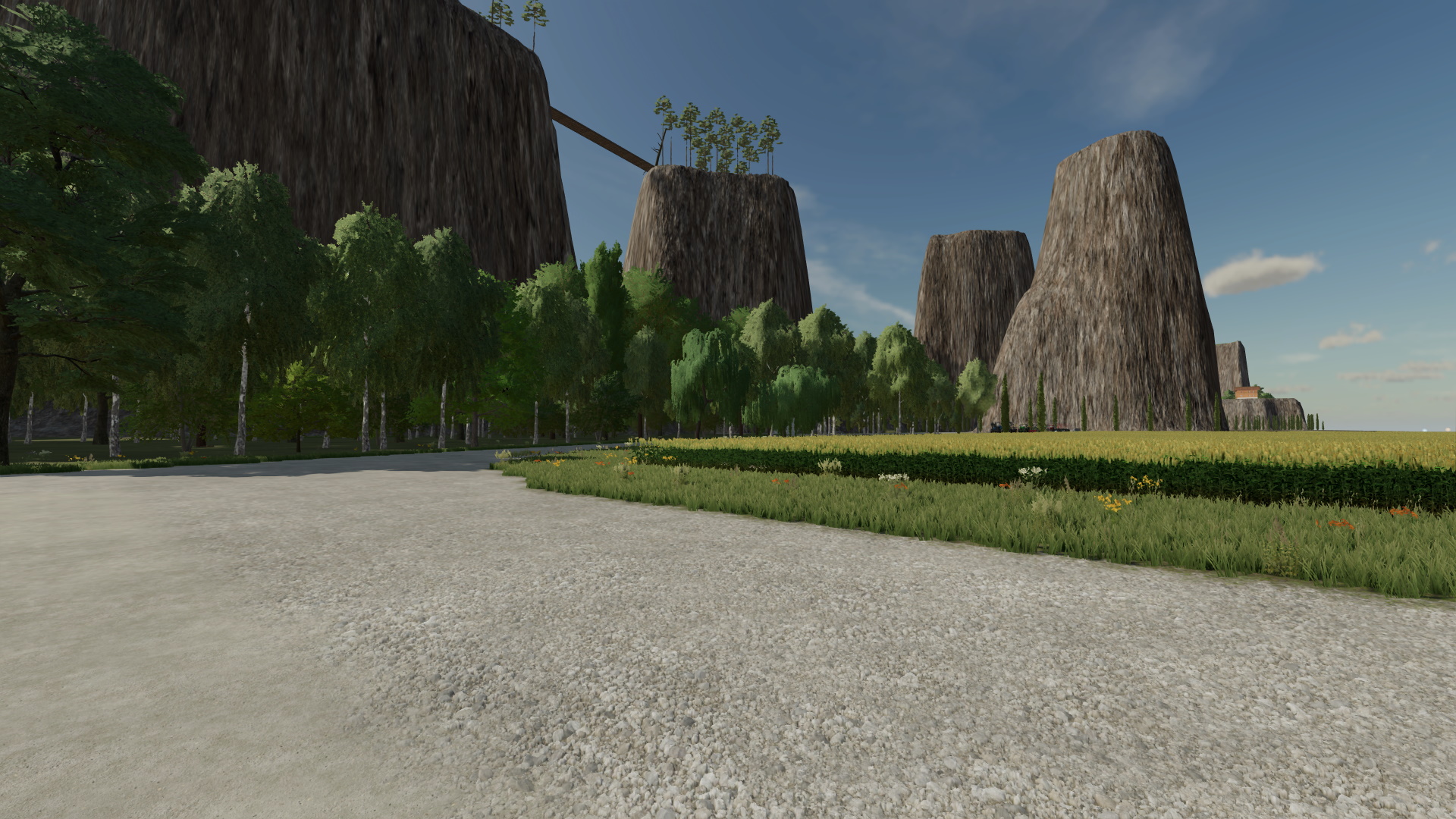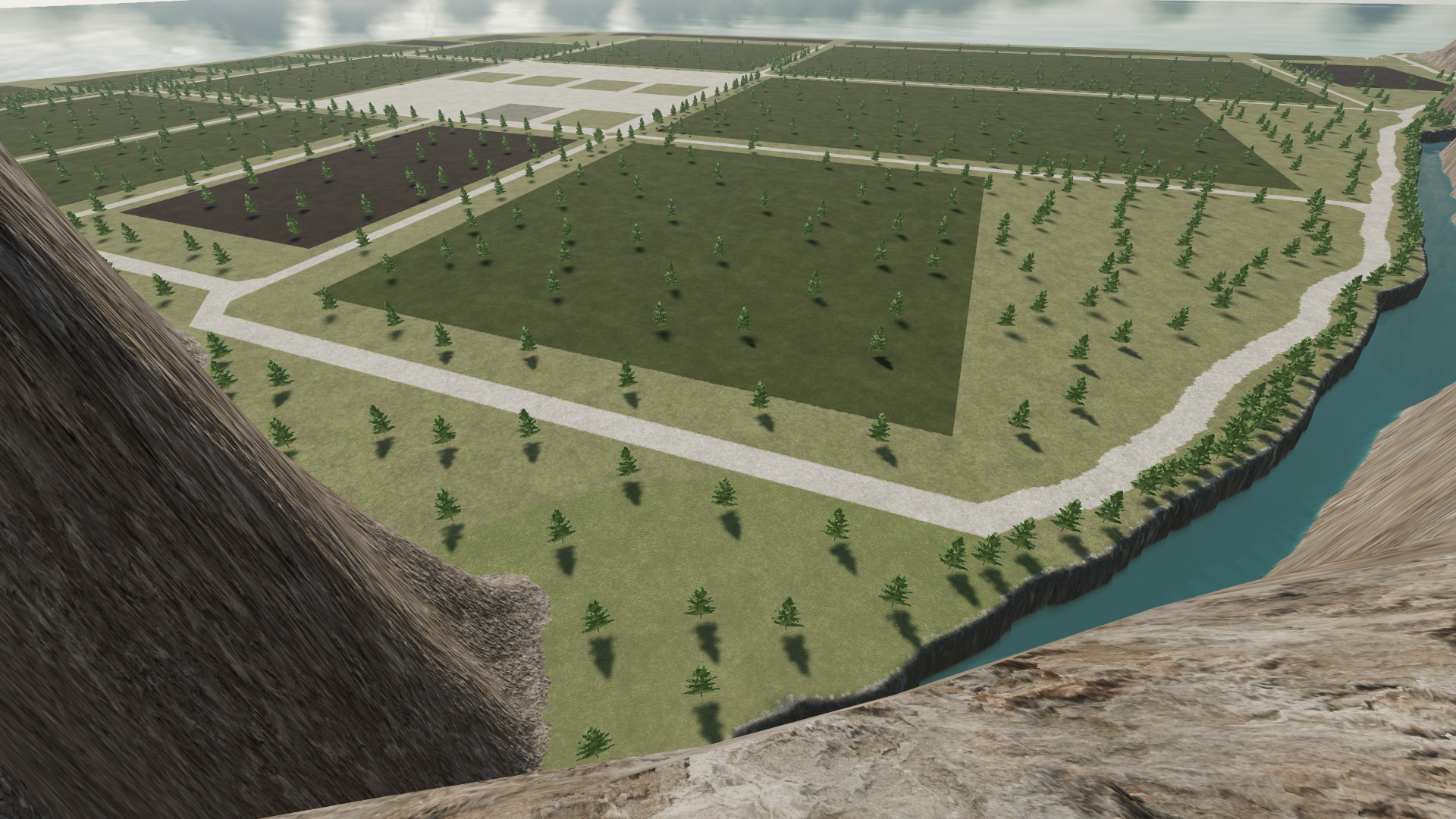 Features high cliffs with forests, and flat land for farming.