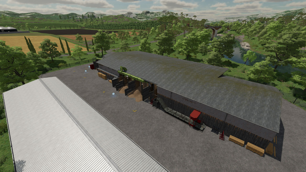 The second farm has a similar set of placeables to the start farm but without vehicles. It has a modded multi silo,