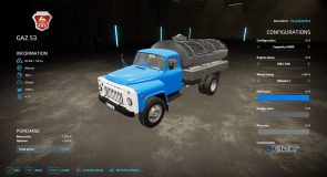 Added GAZ 52 design – it can be selected in the Configuration menu. Firstly is the GAZ 53 design with configurations of 5000 l, 6500 l, 8500 l forage wagon, flatbed, Milk and water body. After that is the GAZ 52 design with the same bodies configurations. GAZ 52 design changes the cab front mask and the truck taillights;