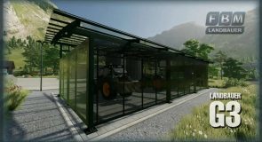 The frame is made of metal, the roof and outer walls are made of smoked glass with UV protection and the subsurface consists of paving stones with curbs. It offers enough space for 3 large machines or vehicles. The Landbauer G3 is part of the “Modern Architecture in Agriculture” building series.