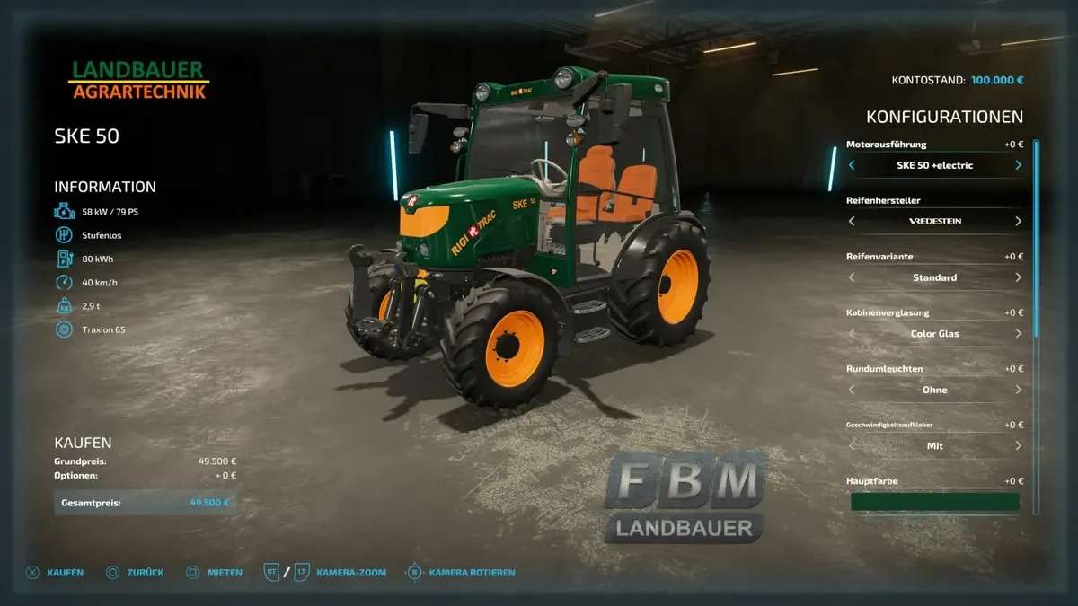 The RigiTrac SKE 50 LE is a small electric tractor and an ideal yard tractor, small, manoeuvrable and agile. The standard version has an output of 68 hp, there is also a +electric version with 79 hp. All configurations are standard in the Landbauer and free of charge.