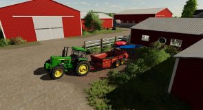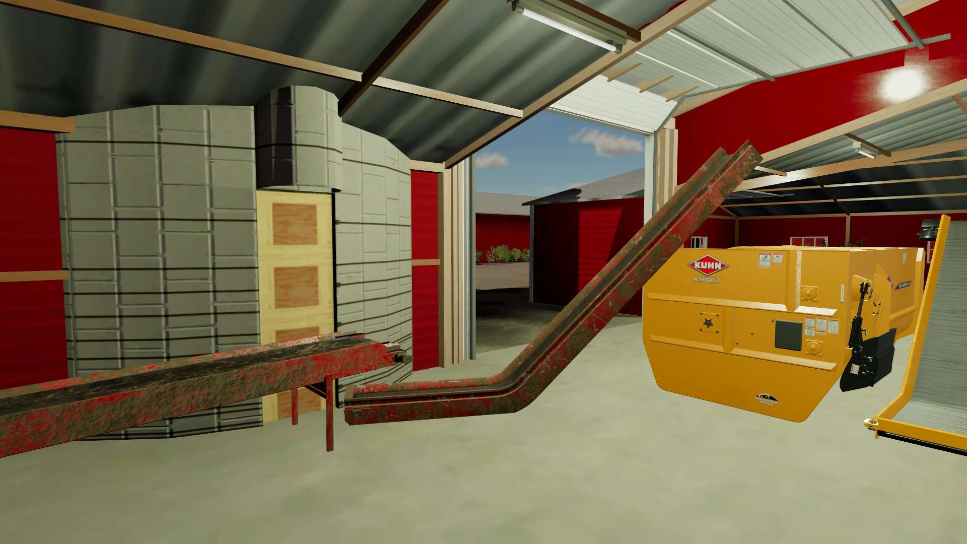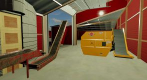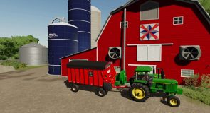 The feed room area was reworked, and a large garage door was added for being able to more easily fill the mixer, if using ag bags or a placed bunk silo. The mixer is a stationary unit, you must enter it like a vehicle, and you can custom tailor your feed ration. Using the mixer requires you to use a feed cart, which you fill using the mixer, and drive into the barn, the side closer to the silos, and there you can feed the cows. If you need to feed the outside animals using the silos, by the base of the conveyor is a trigger, that moves the conveyors to a position that you can then back in a mixer or Feed-R-Wagon and fill from the silos. The silos themselves take a variety of different feed types and ferments/stores them until you’re ready to feed.