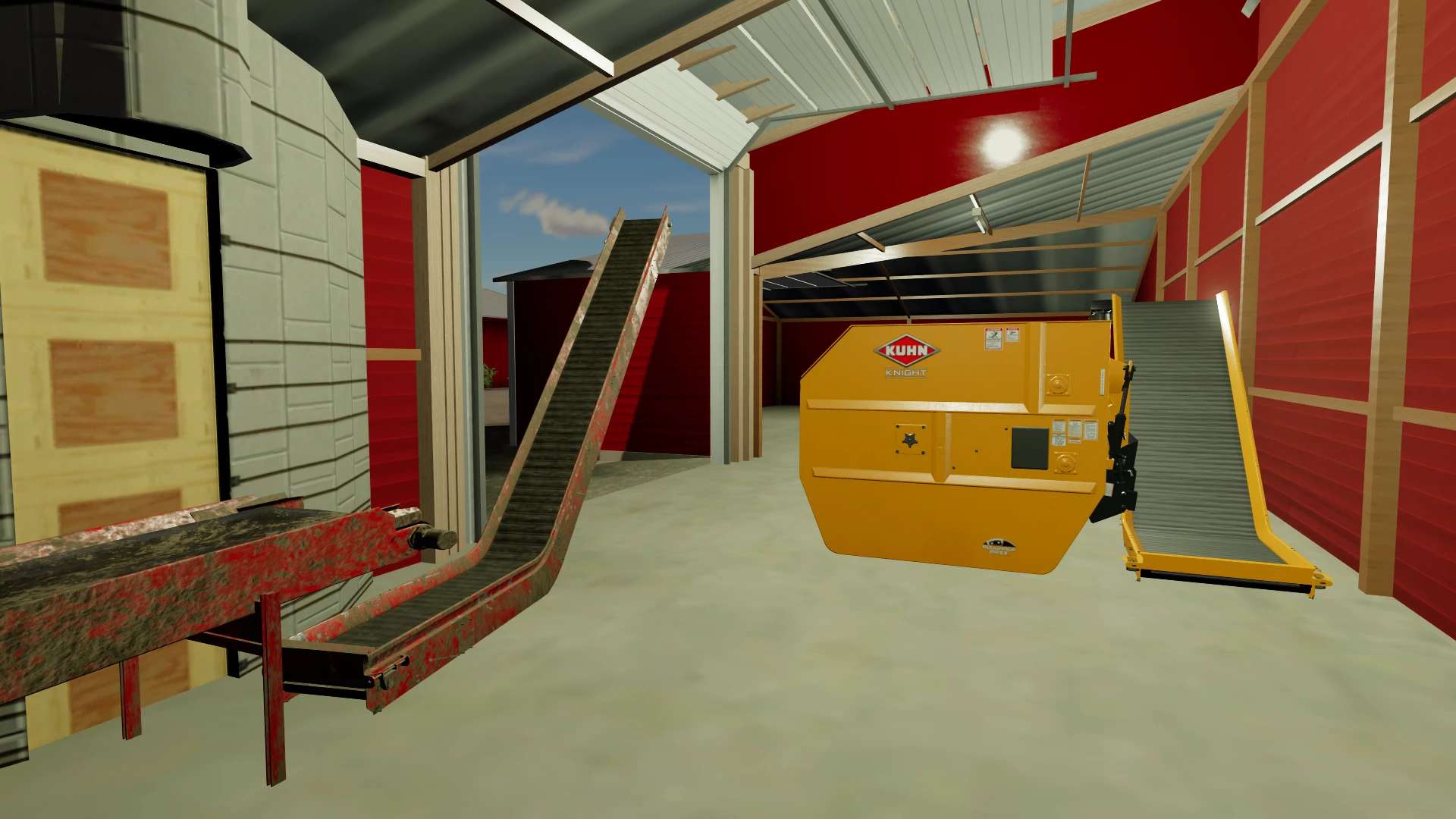 The feed room area was reworked, and a large garage door was added for being able to more easily fill the mixer, if using ag bags or a placed bunk silo. The mixer is a stationary unit, you must enter it like a vehicle, and you can custom tailor your feed ration. Using the mixer requires you to use a feed cart, which you fill using the mixer, and drive into the barn, the side closer to the silos, and there you can feed the cows. If you need to feed the outside animals using the silos, by the base of the conveyor is a trigger, that moves the conveyors to a position that you can then back in a mixer or Feed-R-Wagon and fill from the silos. The silos themselves take a variety of different feed types and ferments/stores them until you’re ready to feed.