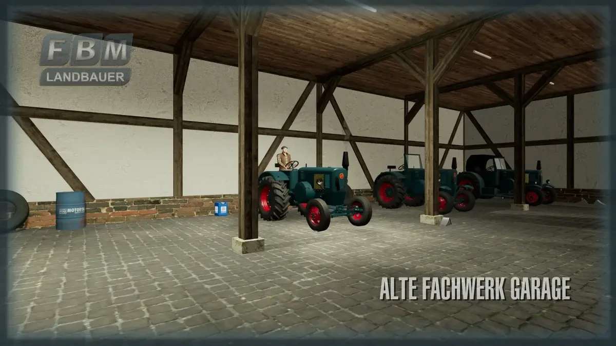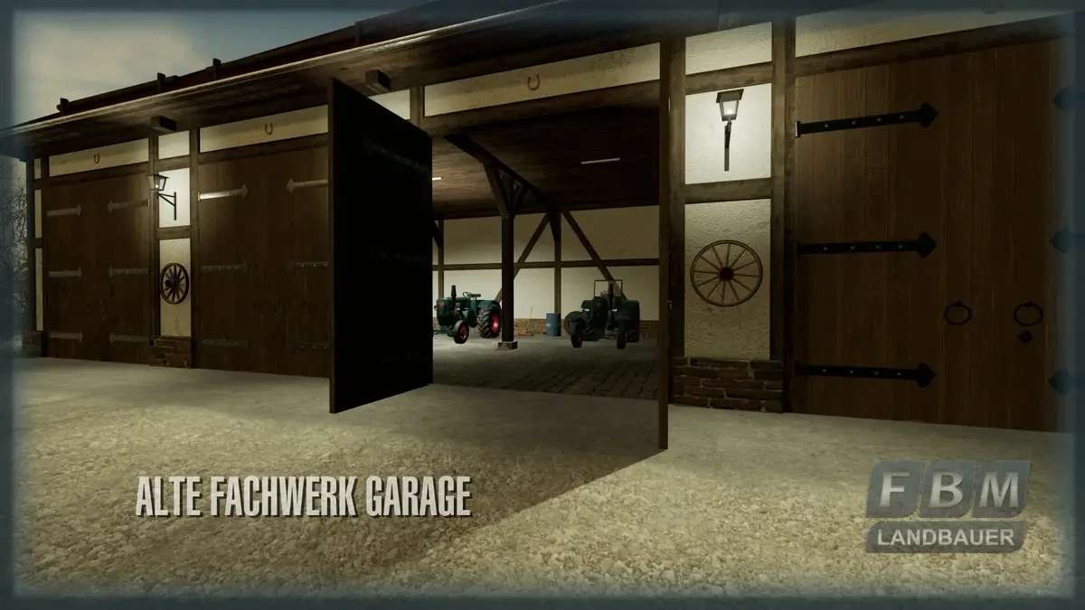 An Old Renovated Half Timbered Garage with Space for 4 Large Trailers or Equipment. This old half-timbered barn is a replica of a restored building on a horse farm in Bavaria. She has manual interior lighting and automatic exterior lighting, in addition, she is equipped with some decorative objects inside and outside. Some decorative objects and the power box (on the side of the building) can be shown or hidden using the interactive function.