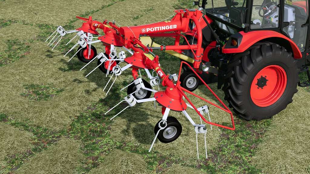 The Pöttinger HIT 47 N is a 4 rotor tedder with 6 arms and hydraulic lifting and turning for the outer rotors for a secure and space saving transportation.