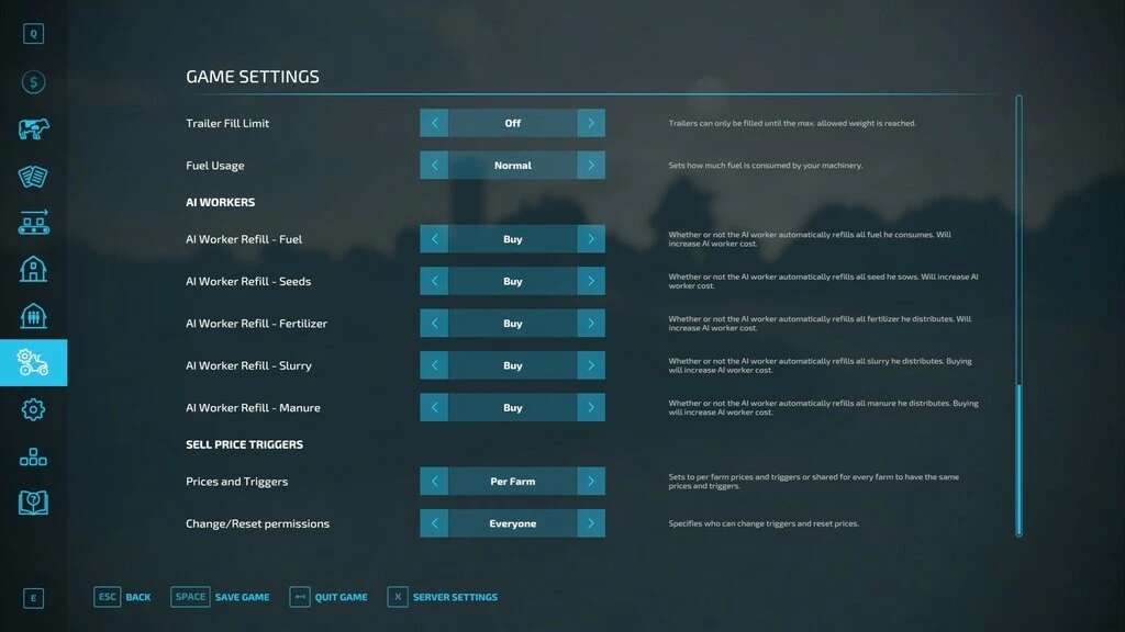 Permissions can be set in multiplayer to farm managers or everyone. This multiplayer settings are only available by server admin in the game settings tab.