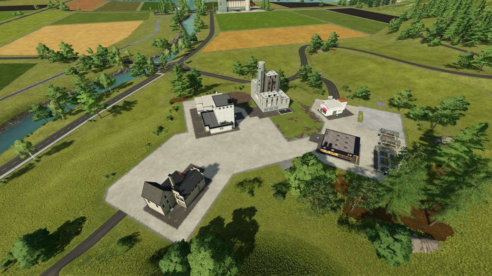 This mod pack for Farming Simulator 22 features the base game production buildings but set to snap at 45 degree angle rotations only.