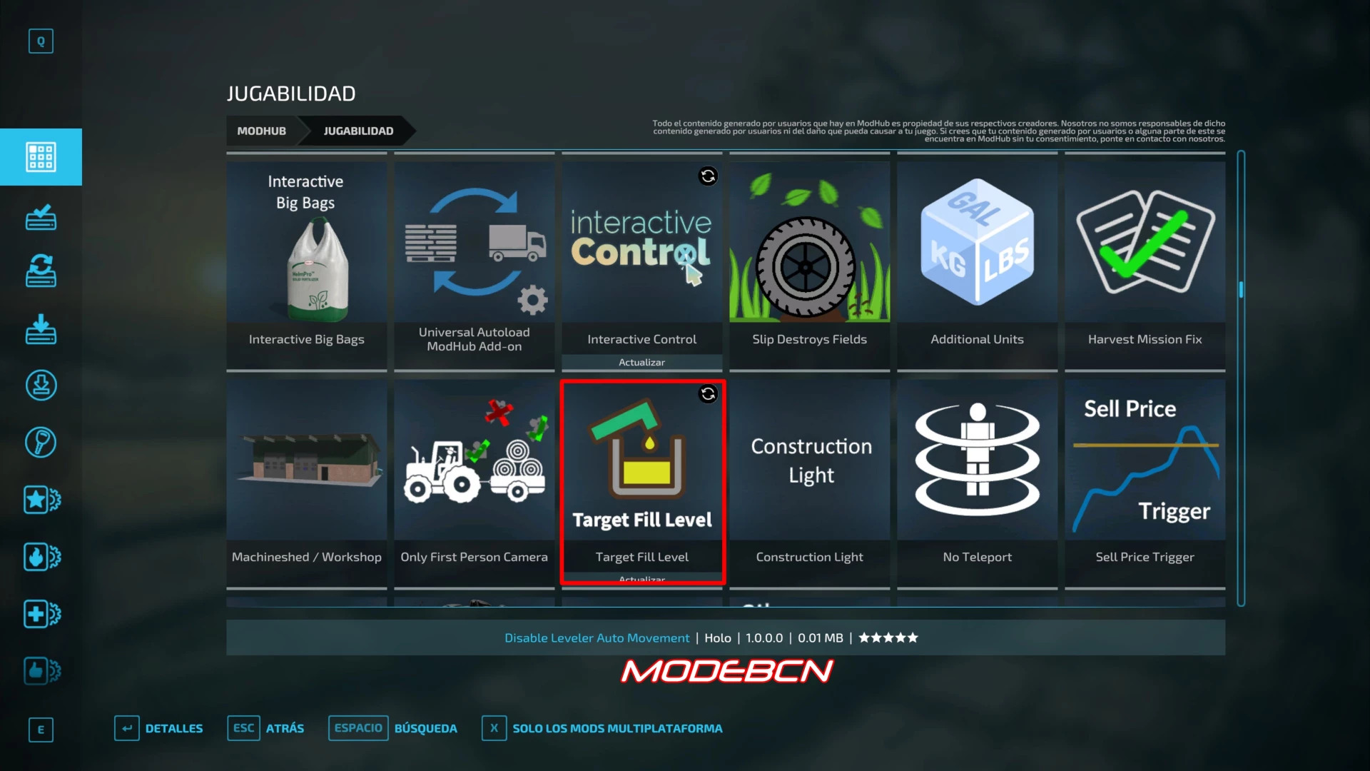 Translation of the mod FS22_TargetFillLevel to Spanish ,just unzip the file and drag the content into the mod