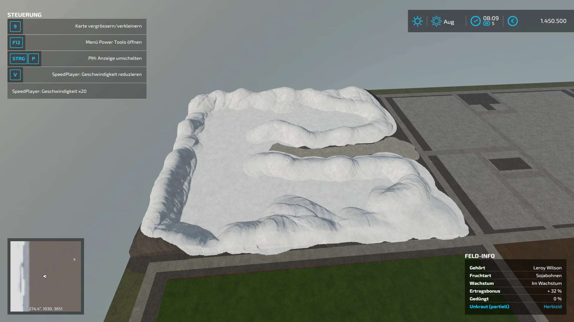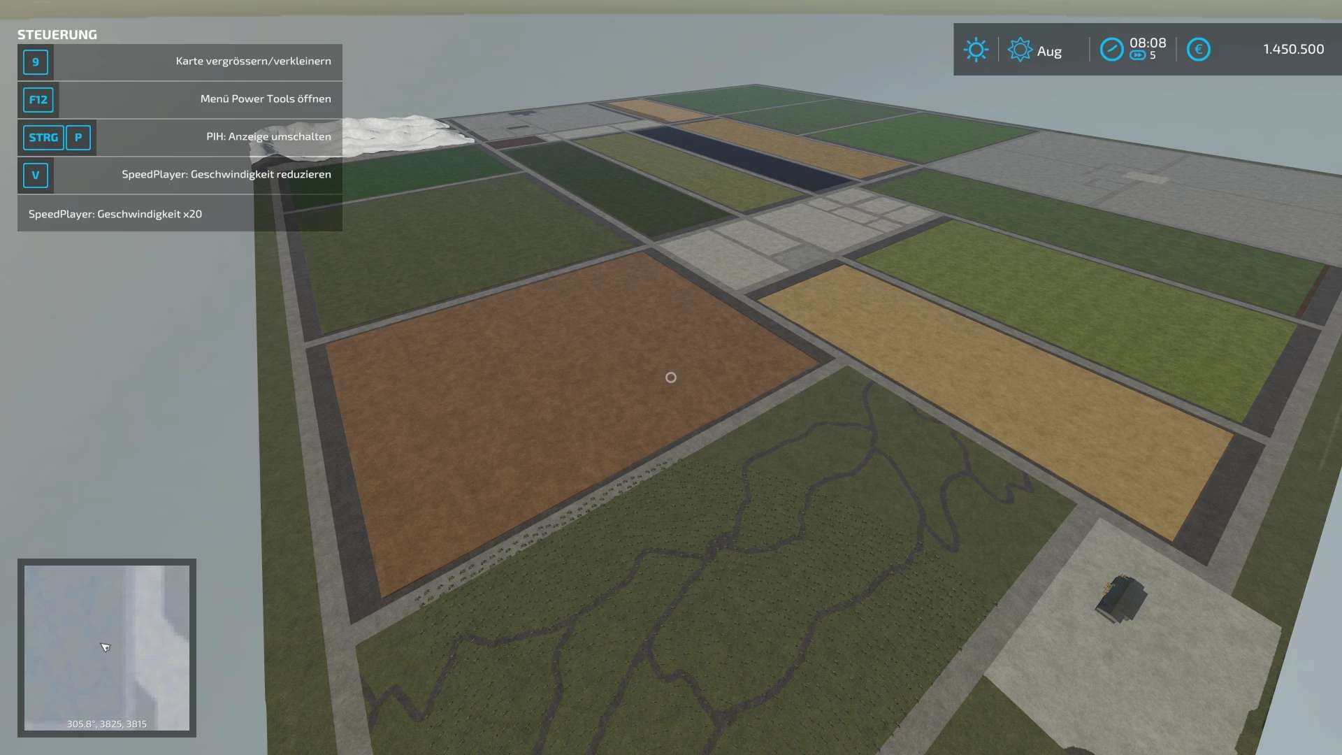 It is a 4-fold map with 14 large fields and a lot of free buildable area without decoration. The map is located on completely flat land.