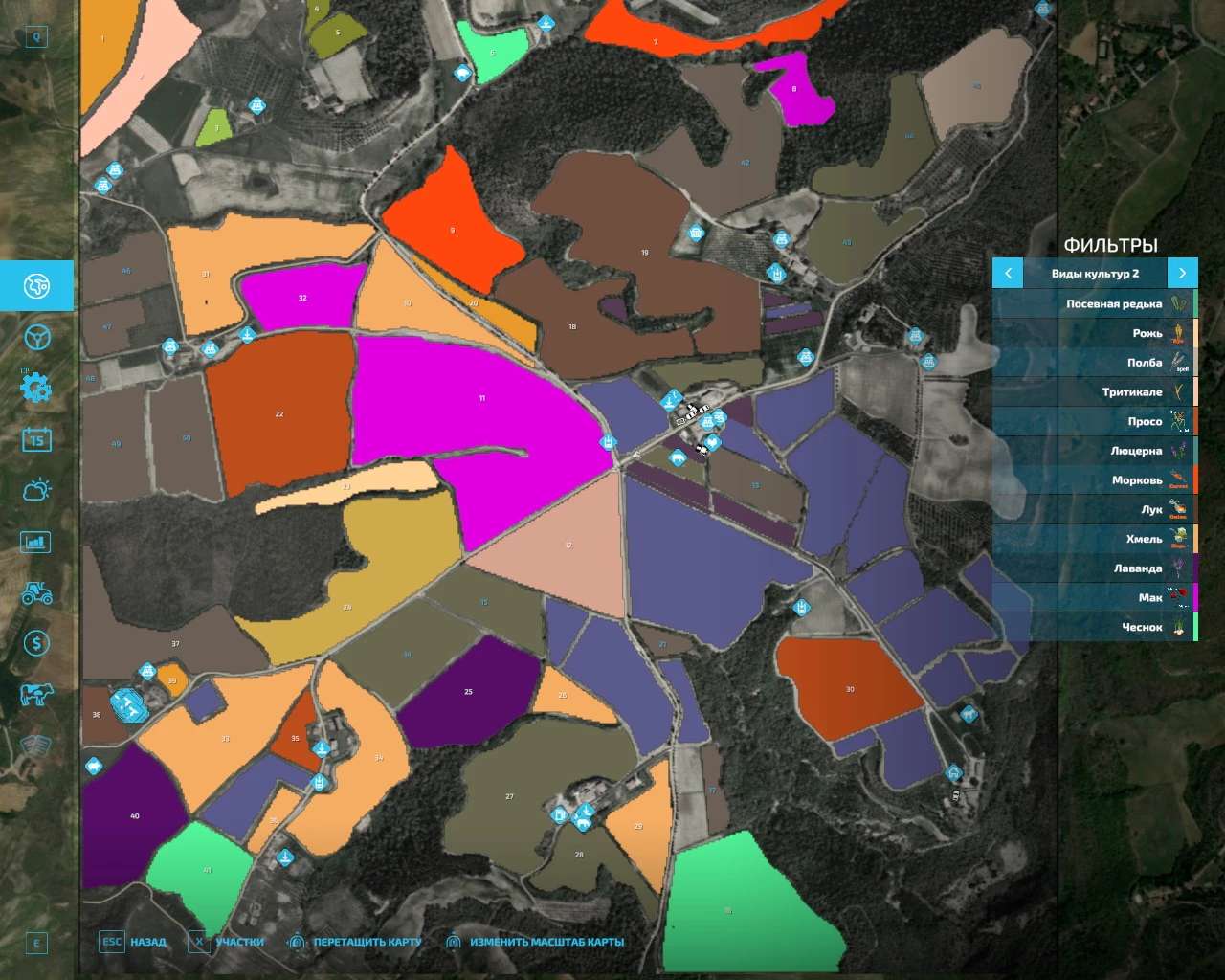Real Google terrain, 11 new fruits, 45 farmlands, 50 fields (0.2-13 ha, including 6 grassfields), 4 forests (more than 9,400 trees), 19 vineyards, 7 olive groves, cosy villa with a pool, 4 lakes with water intake, vehicle shop, workshop, gas station, cow barn and livestock market, all the animal types, 7 sell/buy points, 18 production points, 2 bunker silos, 4 storages, Central Italy GEO, friendly neighbors and good contracts.