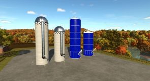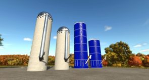 A pack of American silos with varying productions. These concrete and steel silos come in small or large sizes and they have the ability to accept bales directly.