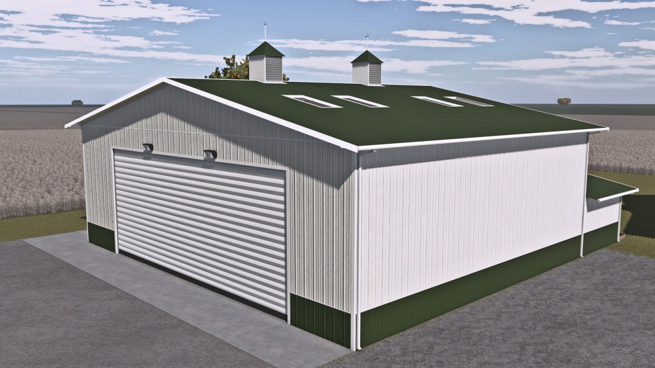 American hall with workshop. Building has three roller doors, one small double and one person doors. Here You can store grains or vehicles. It has lightning inside and outside. Color configuration.