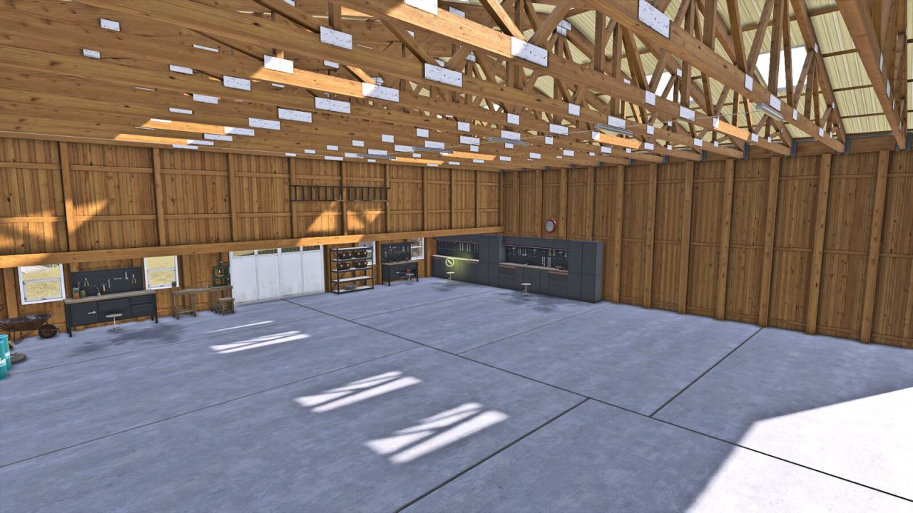 American hall with workshop. Building has three roller doors, one small double and one person doors. Here You can store grains or vehicles. It has lightning inside and outside. Color configuration.