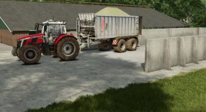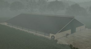 This mod contains two cowsheds, build around 2000. Feeding and adding straw is done in the middle. Milk can be taken from the front. The milking area is not enterable. There is no manure storage. Straw can be spread to simulate filling the boxes, but doesn’t appear visually. Slurry can be taken from the back.