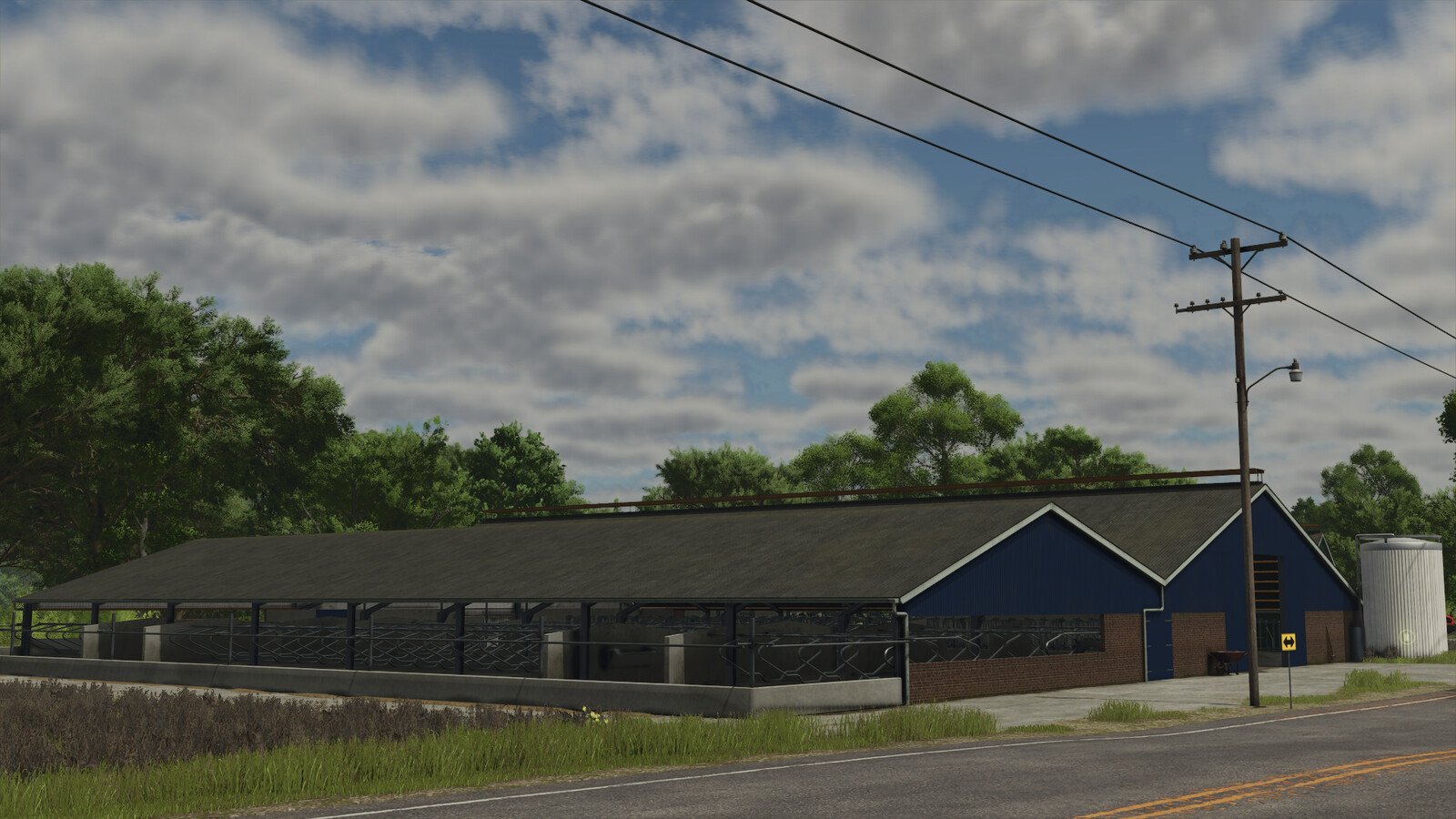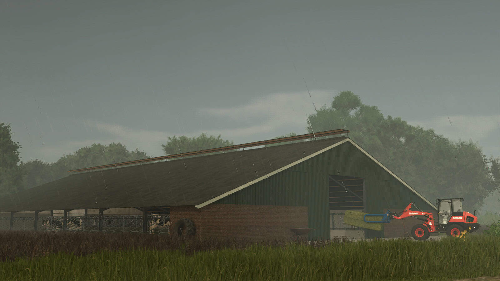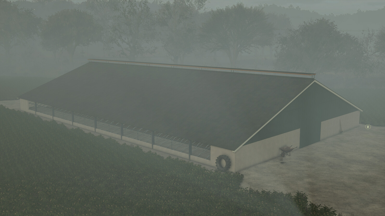 This mod contains two cowsheds, build around 2000. Feeding and adding straw is done in the middle. Milk can be taken from the front. The milking area is not enterable. There is no manure storage. Straw can be spread to simulate filling the boxes, but doesn’t appear visually. Slurry can be taken from the back.