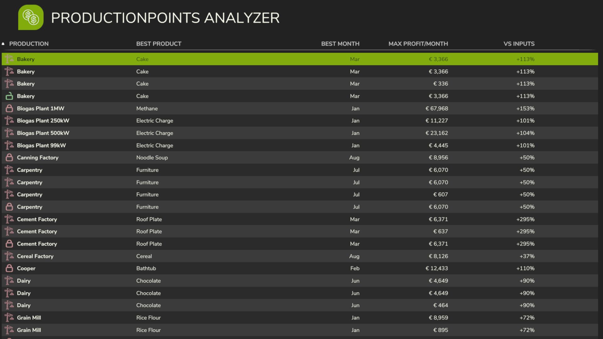 With Economy Analyzer of Productionpoints, all productions on the map are displayed in one unified view, clearly showing which productions you already own and which are still available for construction. Buildable productions that have not yet been placed are marked with a dedicated icon, making it easy to compare options and plan investments before committing resources. This allows players to evaluate profitability early and avoid costly mistakes.