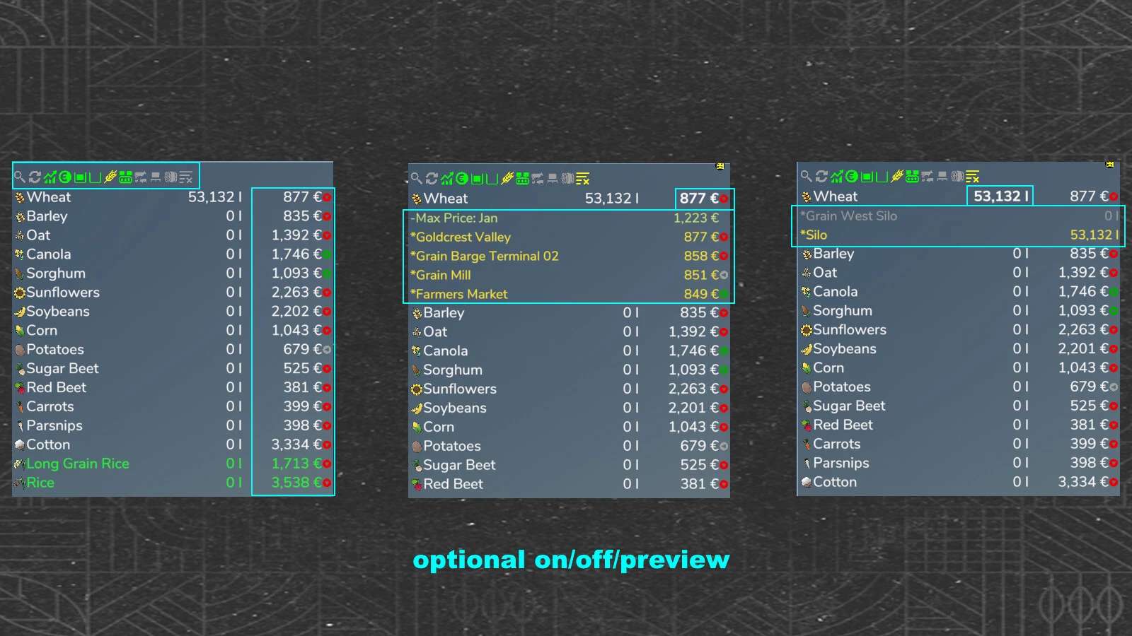 – Information on stocks/prices/best price that can be switched on and off…