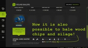 The Göweil Vario Master Plus adds silage and wood chips to the default Göweil VARIO-Master V140, to create unwrapped 125 cm or 150 cm round bales, in addition to the filltypes already present in the default version.