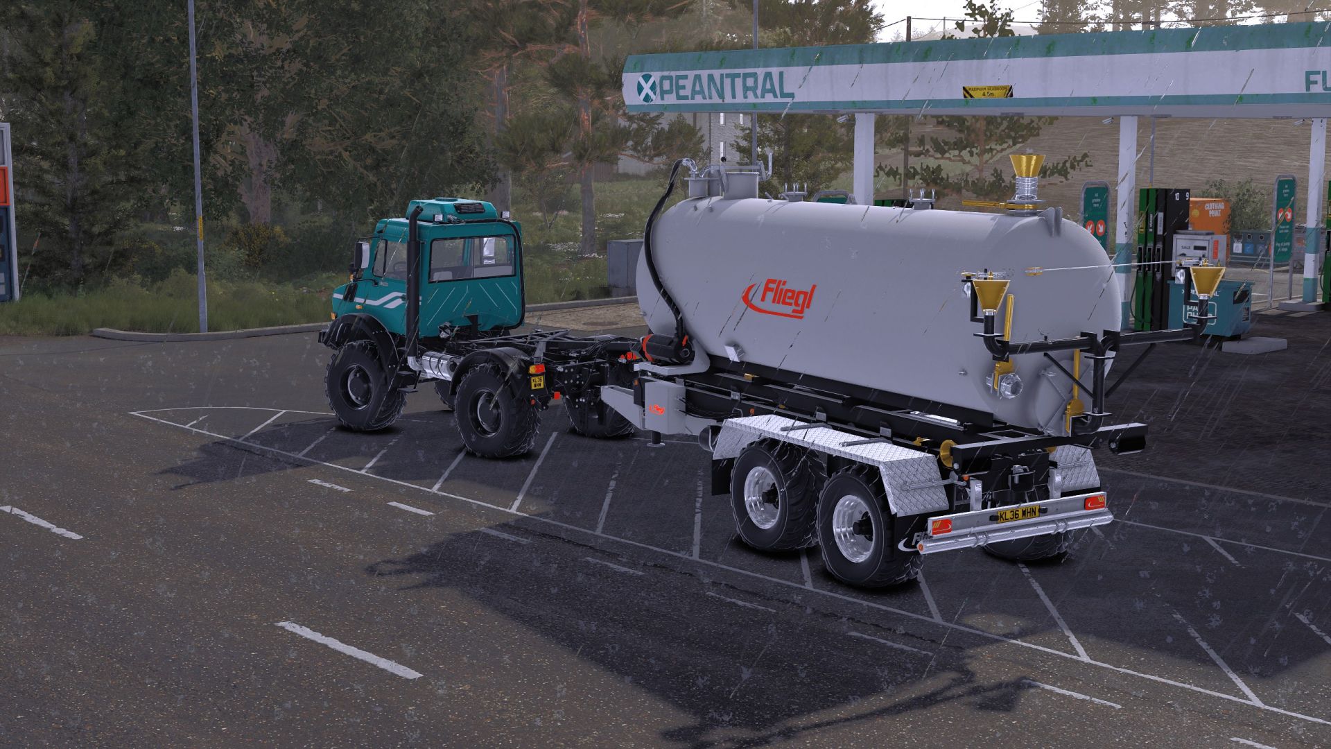 – Slurry and digestate spreader tank with a 10,600L capacity (Does not work with AI if you use the Fliegl HookLift trailer; it must be operated manually. If you use, for example, the Mercedes truck, it works perfectly with AI.)