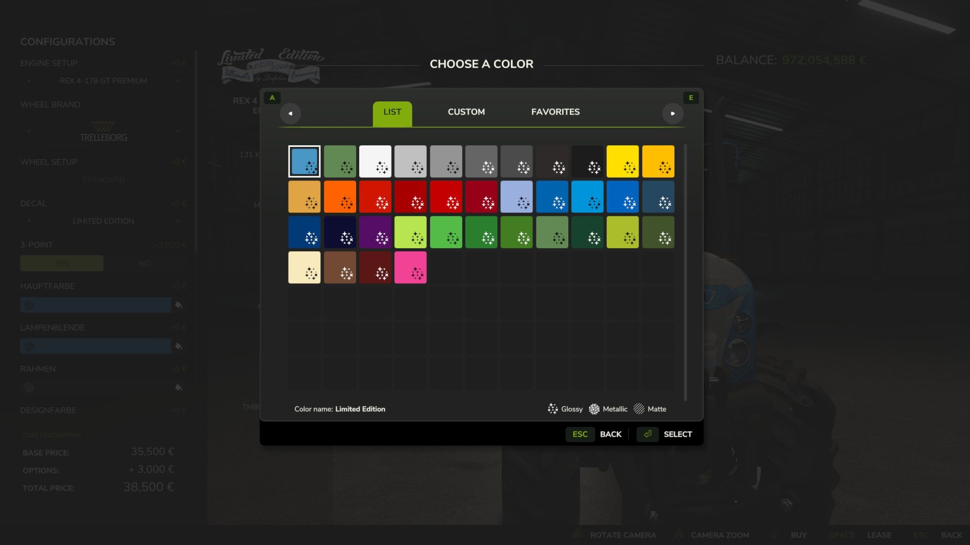 Color choices for main color, headlight bezel, frame, design color, interior design, interior design 2, interior design 3, engine decal, grid, and rim color.