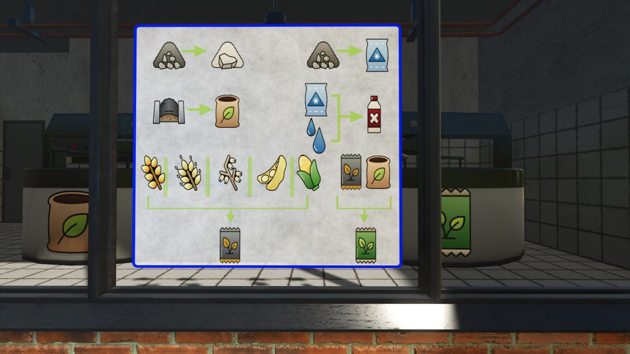 When wheat, barley, soybean, or corn is tipped to this building it will be converted to raw seed. Raw seed and fertilizer will produce seed.