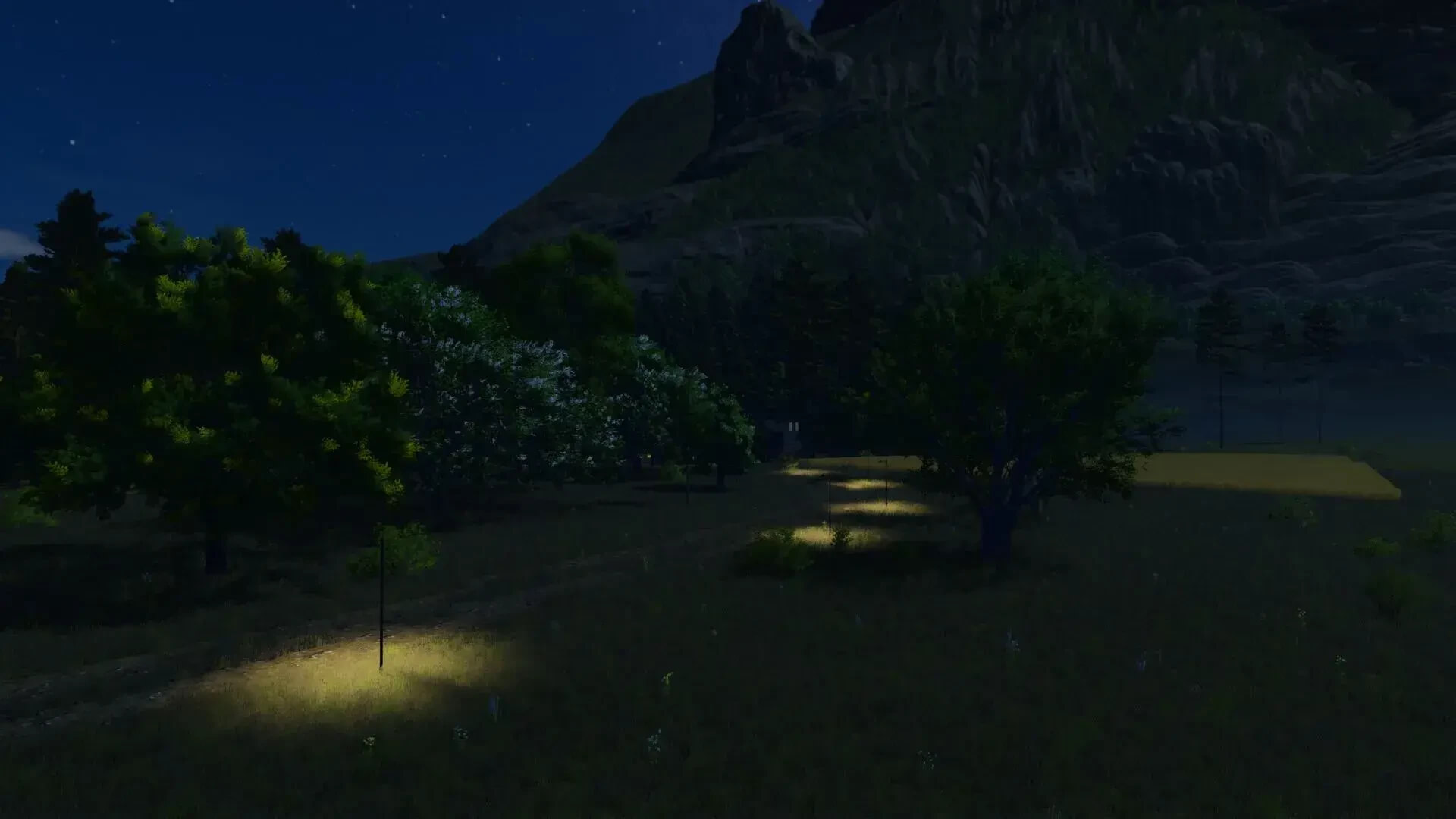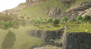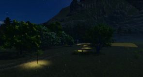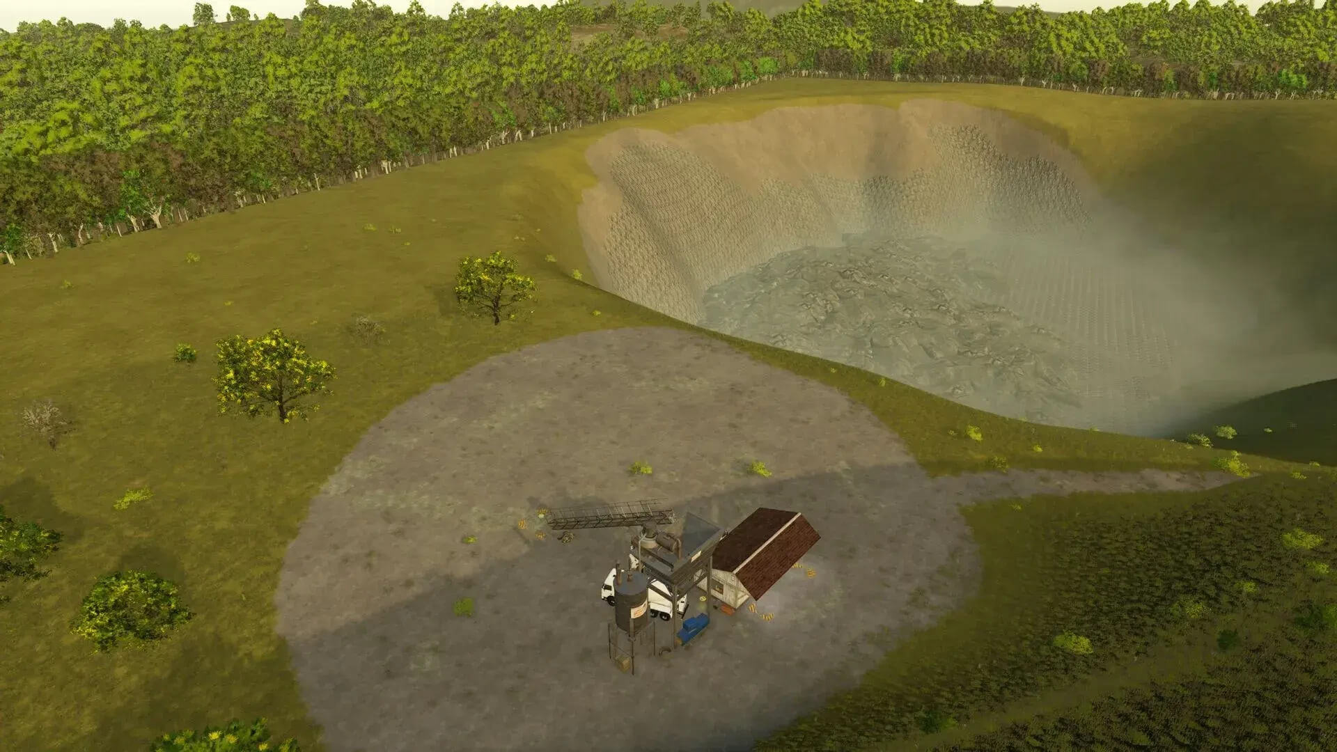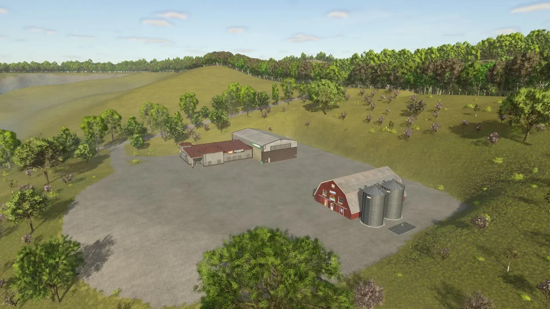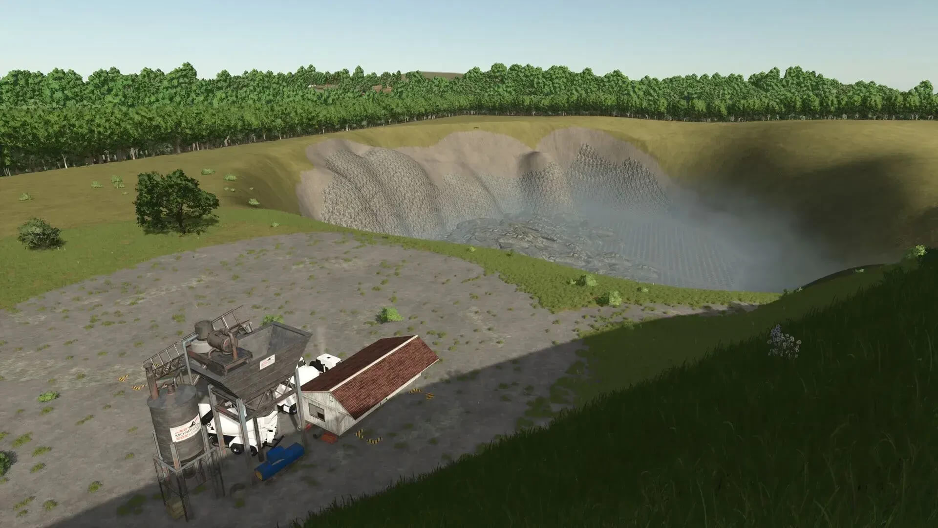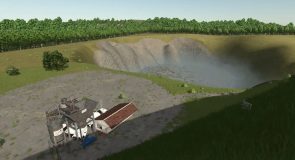 Lone Hills offers a beautiful landscape with a lake, a small swamp area with shallow water (as far as I know, this has no effect on the sinking depth, but I think it looks good), large areas for cultivation, a sawmill, a small sales outlet for milk (AKA milk production), a quarry with destructible rocks and a farmer’s market.